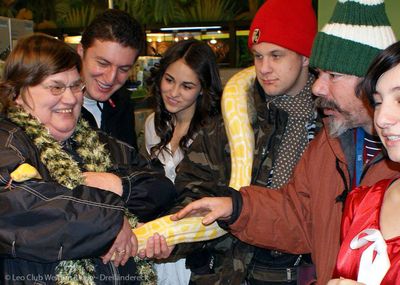 Die Gruppen trafen sich in Friedlingen und unternahmen einen Abstecher zum Kölle-Zoo im Rhein Center. Dass man sich dort viel länger als geplant aufhielt, lag vor allem daran, dass man Bekanntschaft mit einer Albino-Tigerpython schließen konnte. Betriebsleiter Matthias Levy war so freundlich, der Gruppe die handzahme Schlange eine Stunde lang zu überlassen. Im Beisein der Tierpflegerin, die das zirka 2,50 m lange, acht Kilogramm schwere und vier Jahre alte Prachtexemplar groß gezogen hat, legte sich eine anfänglich noch vorhandene Scheu bei Jung und Alt sehr schnell.