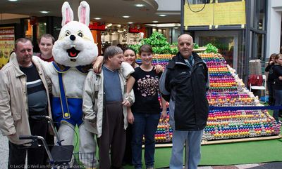 Die Leos verkaufen in der Karwoche wieder 12.000 Ostereier im Rhein Center. – Wenn das kein Grund für einen Abstecher nach Weil am Rhein ist! So dachten Dieter, Uwe & Co. aus dem Markus-Pflüger-Heim in Wiechs. Zusammen mit zwei Betreuerinnen besuchten sie ihre jungen Freunde am dritten von vier Verkaufstagen. Mehr als drei Viertel der größten Anhäufung von Ostereiern weit und breit waren zum Zeitpunkt ihres Besuchs bereits verkauft, aber die Pyramide präsentierte sich ihnen noch immer recht farbenfroh.