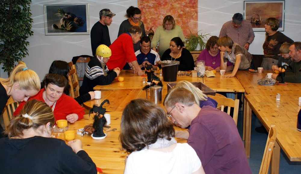 Rasch bildeten sich zahlreiche kleine Arbeitsgruppen mit Personen gleichen Interesses. Mit dabei waren auch vier Praktikanten aus der 8e der Theodor-Heuss-Realschule Lörrach.Während ein Schmuckstück nach dem anderen fertig wurde, war in der Küche das Projekt-Urgestein Dieter damit beschäftigt mit der Unterstützung von Betreuerin Claudia zwei Schwarzwälder-Kirschtorten zu kreieren. Ein großes Blech mit “Donauwellen” wartete ebenfalls auf den Verzehr durch die zahlreichen jüngeren und älteren Hobbykünstler. Das Schöne an dieser Begegnung war, dass am Schluss wirklich jeder etwas Ansehnliches mitnehmen konnte. Das Fazit: “So etwas müssen wir wieder mal machen!