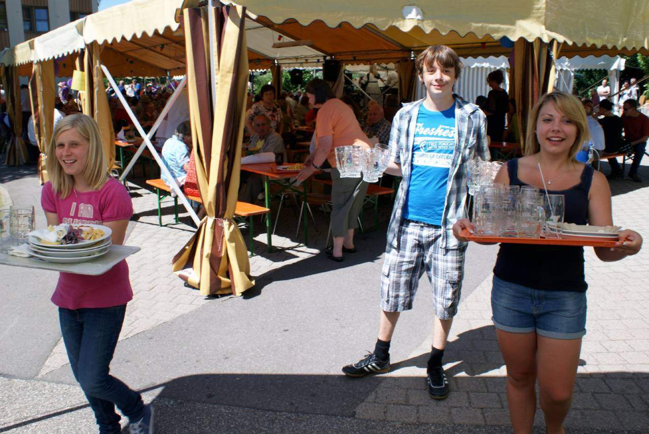 Das Sommerfest ist ein Ort der Begegnung. Es hat Tradition, dass sich hier am ersten Sonntag im Monat Juli viele Angehörige und Freunde einfinden, um zusammen mit den Heimbewohnerinnen und Heimbewohner einen schönen Nachmittag zu verbringen. Klar, dass auch immer einige Leos die Gelegenheit nutzen, um sich mit den Leuten von “Ahorn”, “Linde” usw. zu treffen. Wie jedes Jahr kamen sie am 3.7.2011 auch zum Arbeiten. Zwischen 12 und 17 Uhr wurde jede Menge Teller, Besteck und Gläser von rund 300 Festteilnehmern eingesammelt und zur Geschirrrückgabe bei der Heimküche geschleppt.