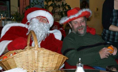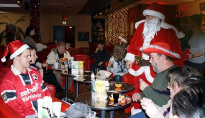 Wie an den anderen drei Samstagen in der Adventszeit waren zahlreiche Leos an diesem Tag von morgens bis abends bei der Weihnachtsmann-Aktion damit beschäftigt, einigen Tausend Kunden mit kleinen Geschenken der Werbegemeinschaft Rhein Center eine Freude zu bereiten. – Ihre eigene Freude war groß, als da gegen 15 Uhr plötzlich Dieter, Uwe & Co. in Begleitung ihrer Betreuerin Claudia Schätzle-Laux auftauchten. Mit dem Heimbus waren sie aus Schopfheim angereist, um die Leos zu besuchen!Kurz entschlossen begaben sich einige Leos mit den Heimbewohnern ins Café beim Kino im 2. OG. Während einige “Engel” ihrem Job im weitläufigen Einkaufscenter weiter nachgingen, nahmen Andreas, Julia S., Julia R. und einige andere eine kleine Auszeit in angenehmer Gesellschaft. Mit dabei war auch für einige Zeit der Weihnachtsmann!