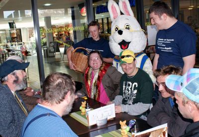 Von 8 Uhr an hatten zahlreiche Leos die Ostereierpyramide im Weiler Rhein Center zusammengebaut und mit Ostereiern bestückt. Rechtzeitig zum Sonntagsverkauf war alles fertig. Zwischen 13 und 18 Uhr wurden rund 3.000 der insgesamt 12.000 von der Werbegemeinschaft Rhein Center gespendeten Eier verkauft. Wow! Das Spektakel wollten sich Tobias & Co. nicht entgehen lassen. Zusammen mit Betreuerin Claudia statteten zehn Heimbewohnerinnen und Heimbewohner den Leos einen Besuch ab. Sie staunten über den enormen Andrang im Center und freuten sich, dass der Verkauf der Ostereier so gut anlief. Gerne nahmen sie die Einladung der Leos zu einem Besuch des Bistros Paparazzi im ersten OG des Rhein Centers an. Klar, dass ihnen dort auch der Osterhase einige Minuten Gesellschaft leistete. Leo Chiara Marafatto aus Rosenau war es, die sich gerade das imposante Kostüm übergestreift hatte und reichlich Süßigkeiten verteilte.