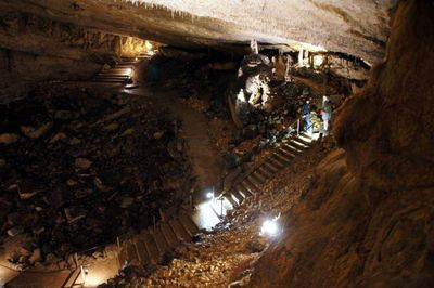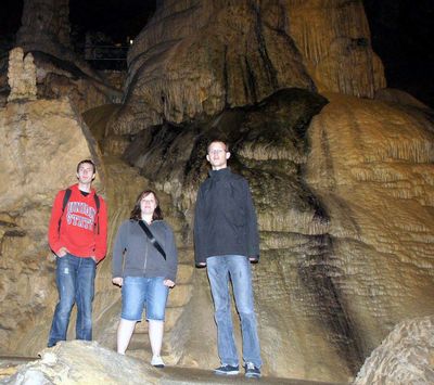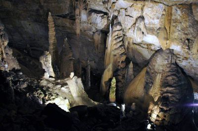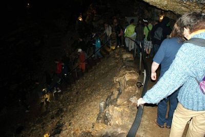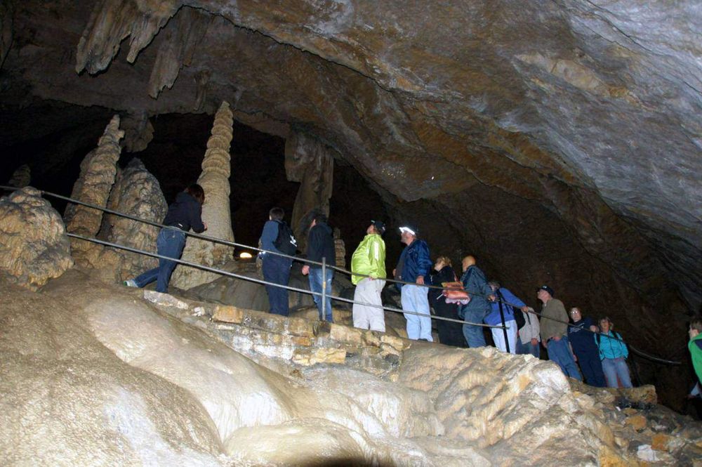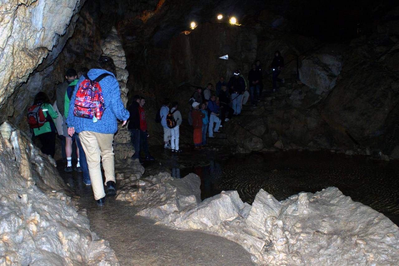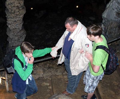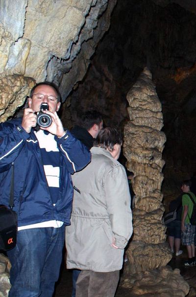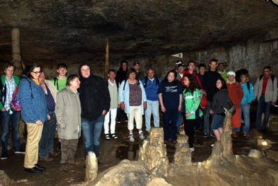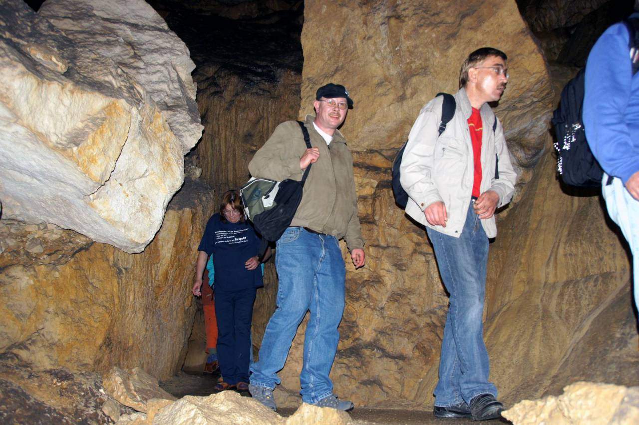 Gestärkt begaben sich danach alle zur vereinbarten Höhlenführung. Zwar ist der Weg durch die gut beleuchtete Grotte durchgehend betoniert und mit einem Geländer versehen, dennoch kostet es vor allem am Anfang, angesichts der steil hinab führenden Treppe, einige Überwindung, in die im Lauf von Jahrtausenden entstandene Zauberwelt einzutauchen. Heimbewohner Uwe, seit der ersten Unternehmung fast immer dabei, hatte sogar den Mut, seinen Rollator oben stehen zu lassen und sich auf die Hilfe der Leos zu verlassen. 70 Minuten lang dauerte das Abenteuer in der Höhle. Gemeinsam staunte man beispielsweise über den 15 m hohen und 250.000 Jahre alten „Dom“, den größten Stalagmiten der Schweiz, den Höhlensee in 100 m Tiefe oder den „Mantel von Napoleon“, den größten Stalaktiten der Höhle.