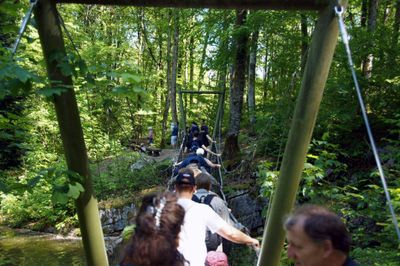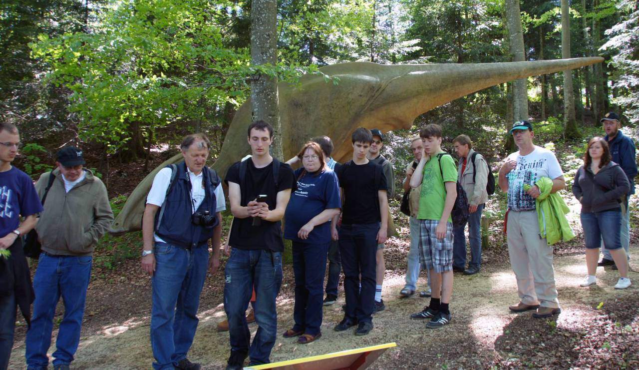 Wieder am Tageslicht, folgte ein Rundgang durch den Dinosaurierpark. Und das Staunen ging bei Tarbosaurus, Stegosaurus & Co. weiter. Neben all den fantastischen Exponaten in Lebensgröße wird den meisten auch der gemeinsame Gang über eine Hängebrücke in Erinnerung bleiben. Vor den Augen eines weit aus dem Weiher herausragenden Ichthyosauriers, machten sich alle gegenseitig Mut und schafften es schließlich in der Gruppe problemlos, den wackeligen Weg zu bewältigen.
