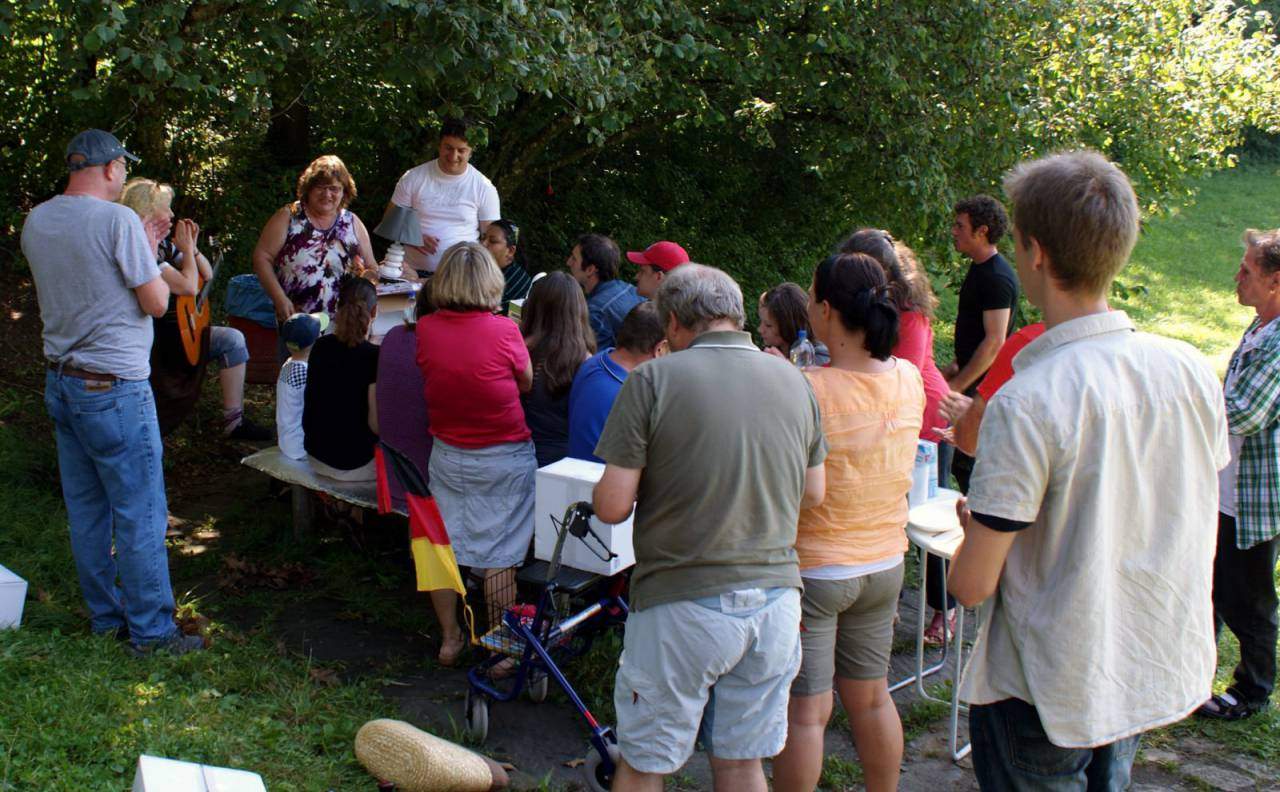 Ein schöner sonniger Spätsommertag und die Leos sind groß zum Essen eingeladen! Die Gastgeber sind die Bewohner der Außenwohngruppe „Linde“ des Markus-Pflüger-Heims. Roswitha hatte die Idee, anlässlich ihres Geburtstags die Leos und einige Kollegen von anderen Stationen des Pflegeheims zum Grillen und zu Kaffee und Kuchen an den Eichener See einzuladen.Den beschaulichen Ort mit der großen Schutzhütte am Rand des Ortsteils Schopfheim – Eichen kannten einige Leos bereits von früheren gemeinsamen Unternehmungen mit Heimbewohnern. Der Unterschied zu den bisherigen Ausflügen an diesen Ort, an dem alle paar Jahre mal ein Karstsee erscheint, war der, dass die Leos nicht als Veranstalter, sondern als Gäste kommen durften. Und wie sie verwöhnt wurden! Gemeinsam mit einer Betreuerin hatten die „Linde“ – Bewohner ein Grillevent der Superlative vorbereitet. Leyla, Murat & Co. staunten über die vielen Schüsseln mit bunten Salaten und die selbst gemachten Kuchen. – Eine tolle Leistung!Leo Chiara hatte aus ihrem Wohnort Rosenau im Elsass 50 Pain Chocolat Feuillete mitgebracht; ein Gruß aus Frankreich sozusagen, der umständehalber aber zunächst nur zur Hälfte angenommen werden konnte. Die andere Hälfte gereichte in der „Linde“ am Sonntagmorgen als süße Beilage zum Frühstück…Den Nachmittag verbrachte man gemeinsam mit Spielen und mit fröhlichem Singen. Ein Lied passt vortrefflich zum Projekt „Begegnungen“: „Gut, dass wir einander haben.“