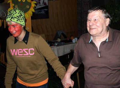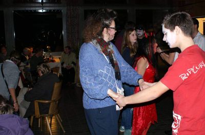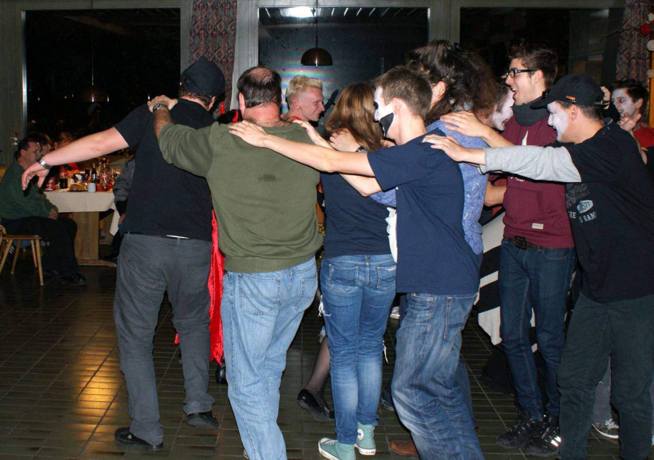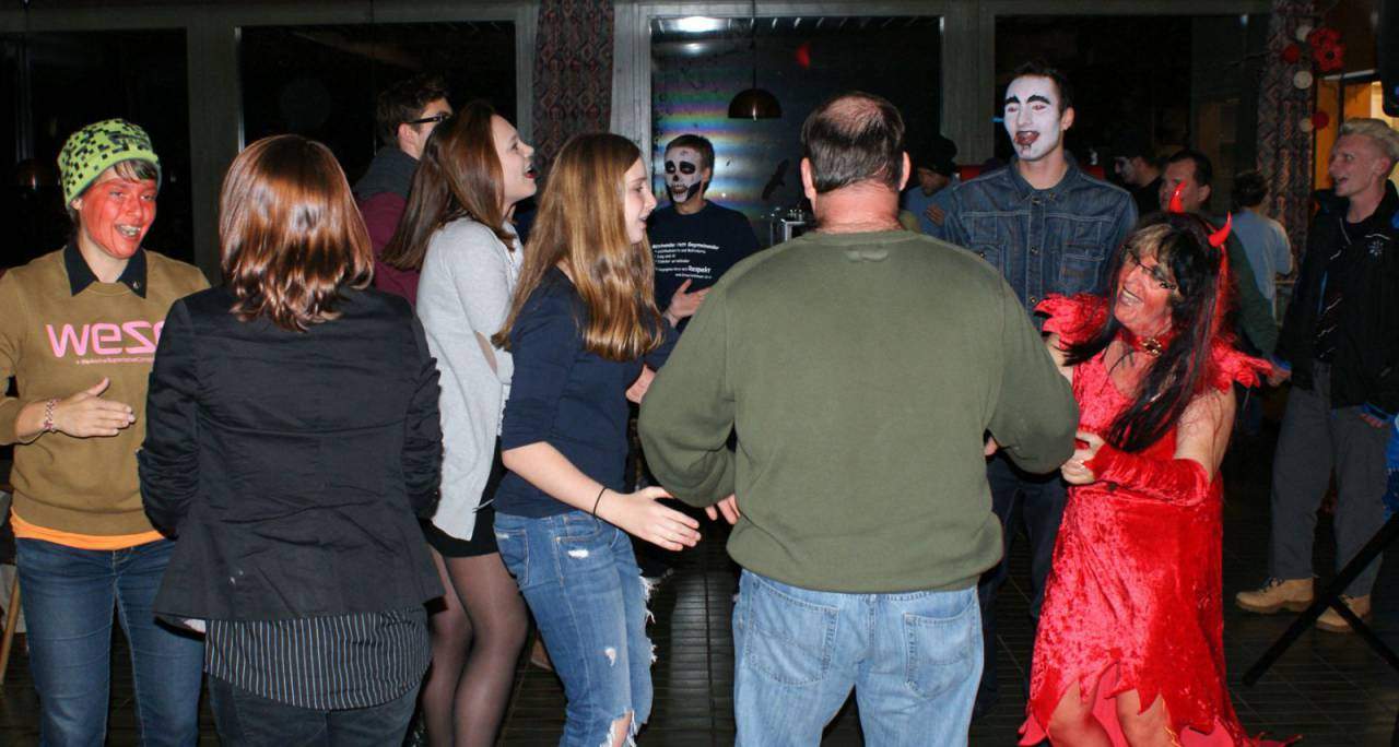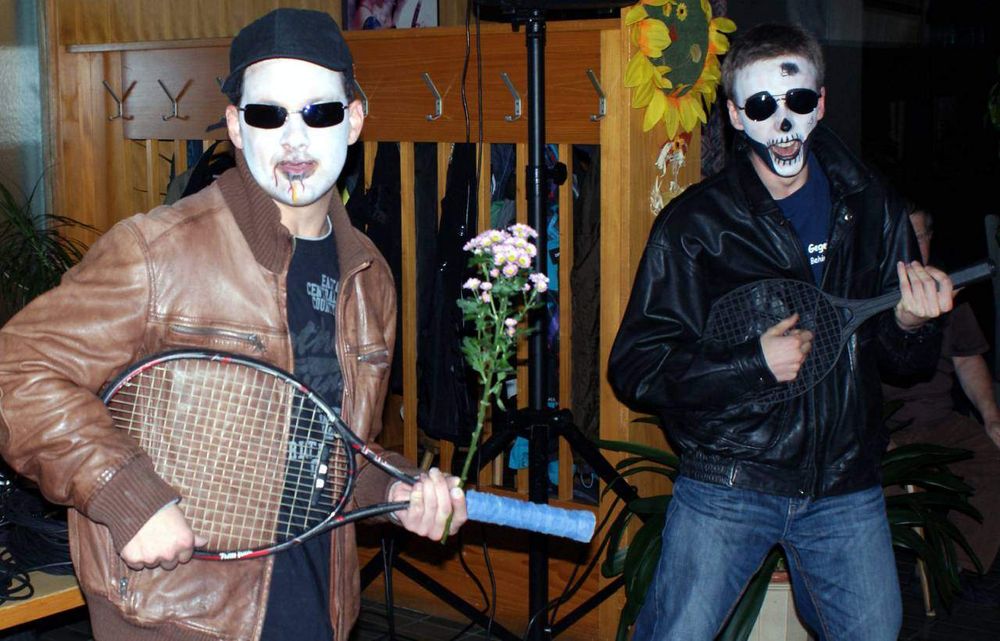 Kurze Zeit später wurde es dann ernst. Der Pinsel tauchte in das fette Schwarz des kleinen Töpfchens und kam glänzend und triefend von der Farbe wieder heraus. Langsam, fast schon quälend, setzte er sich in Bewegung, wobei das Ziel mein Gesicht war. Wenige Sekunden und ein paar tröstende Worte später berührte der nasse und kalte Pinsel erbarmungslos meine Haut und strich dabei mehrere Male hin und zurück. Dabei blieb nichts verschont, selbst die Augenlieder wurden dick mit Farbe eingeschmiert. Nach 15 Minuten regungslosen Verharrens auf dem langsam ungemütlich werdenden Holzstuhl hatte ich es geschafft. Mein erster Weg führte mich umgehend in das WC, wo mich ein Monster im Spiegel erwartete. Ich blickte nicht mehr in mein Gesicht, sondern auf einen Totenschädel mit riesigen Augenhöhlen und blank poliertem Knochen. Sogar meine Nase war verschwunden. Unheimlich! Zurück im Hauptraum angelangt, wurde es dann noch ernster: Die Dekoration war fertig, die Technik machte, was man von ihr verlangte und die Stimmung war gut. Nach und nach strömten die Bewohner dieses sich heute Nacht in ein Horrorhaus verwandelnden Heims in den Saal. Dabei war durchaus Abwechslung geboten, denn neben Gespenstern, Piraten und Zombies waren auch Kürbisse oder stattliche Kerle mit Herzchen auf der Wange mit dabei. Na, dass konnte ja heiter werden!