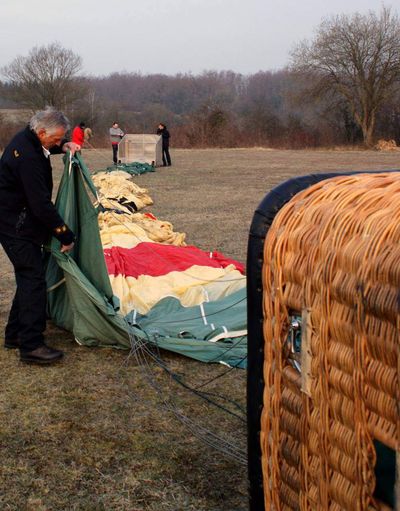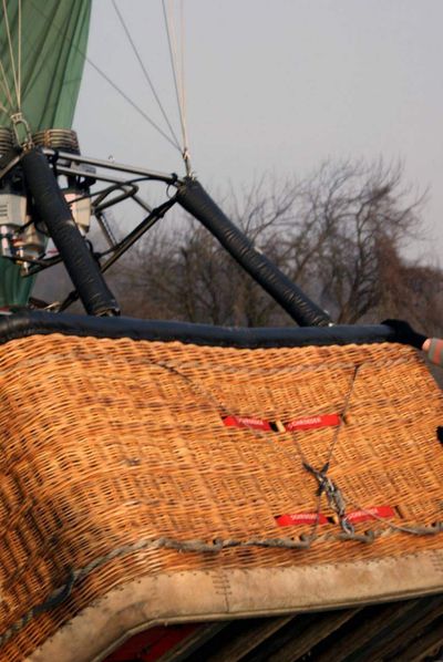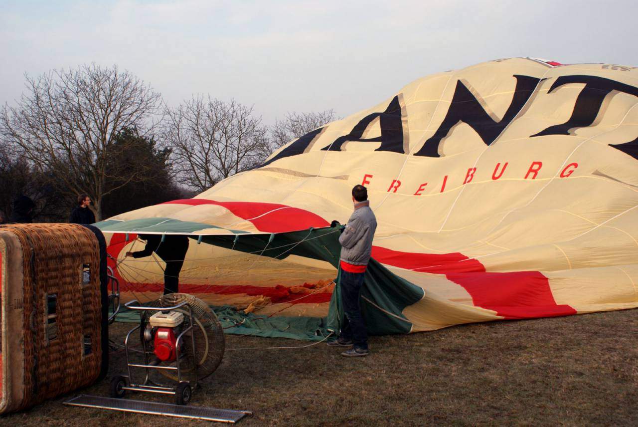Bevor es jedoch in die Lüfte ging, musste der Ballon aufgebaut werden. Dazu trafen sich Leos und Ballonfahrer Fritz Klank mit seinem Kollegen Daniel morgens um 8:00 Uhr auf dem Segelflugplatz in Müllheim, warm eingepackt in langen Unterhosen und dicken Mützen. Der Aufbau wurde durch die routinierten Fachgriffe der beiden Piloten schnell erledigt, in Windeseile war der massige Ballon aus dem Anhänger getragen und auf der Wiese ausgebreitet. Anschließend wurde der Korb auf die Seite gelegt und mit Stahlseilen und Haken an dem Stoff befestigt. Zwei große Ventilatoren sorgten nun dafür, dass genügend durch Gasbrenner erwärmte Luft in den Ballon geblasen wurde, damit dieser aufgerichtet werden konnte. Dies geschah erstaunlich schnell und ließ uns ehrfürchtig nach oben blicken, denn die Ausmaße des Ballons waren schier unglaublich. Aber erst einmal hieß es: Bitte einsteigen! Der Korb bot Platz für zehn Personen inklusive Fahrer, welcher in seiner eigenen „Abteilung“ in der Mitte die Knöpfe und Hebel bediente. Das Einsteigen klappte auch bei allen Bewohnern problemlos, so dass der Reise nichts mehr entgegenstand.