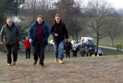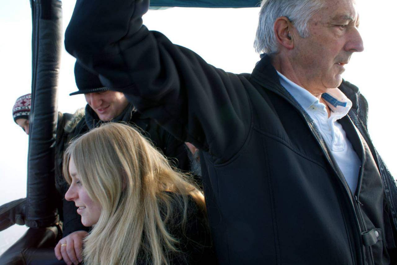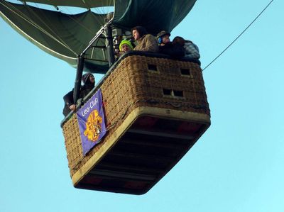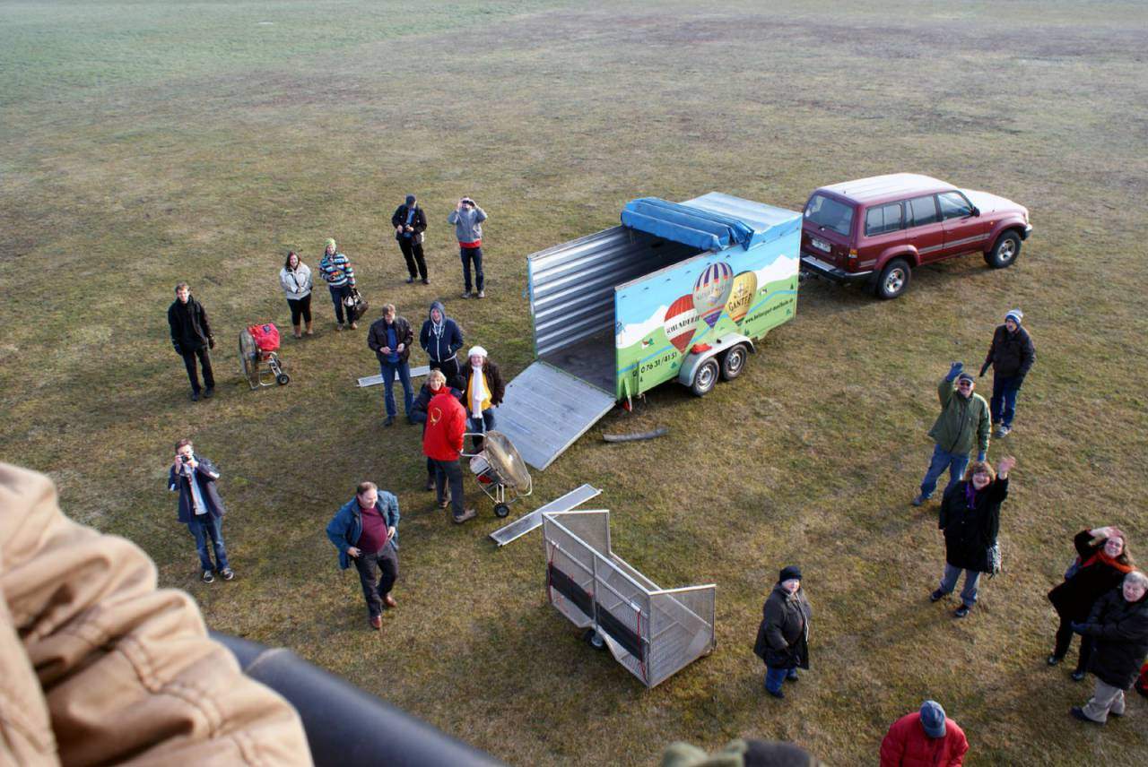 Der Start war nicht ruckelnd, wie in einem Flugzeug, sondern sanft, fast unbemerkt. Als der Ballon langsam an Höhe gewann, waren das Grinsen und das Gefühl der Freude auf den Gesichtern der ersten Teilnehmer unverkennbar – sie hatten jede Menge Spaß. Schon nach kurzer Zeit, das Rauschen des Gasbrenners ertönte in unregelmäßigen Abständen, war der Ballon auf eine Höhe von über 100 Meter gestiegen. Der morgendliche Dunst der tief hängenden Wolken und Nebelfelder ließ den gelben Stoff für die zurückgebliebene Bodengruppe grau wirken, die Personen an Bord waren fast nicht mehr erkennbar. Das Rauschen war nicht wahrnehmbar, die Vögel sangen dafür wieder ihr morgendliches Lied. Doch für Entspannung blieb kaum Zeit: Für die Bodengruppe stand eine Verfolgungsjagd an.
