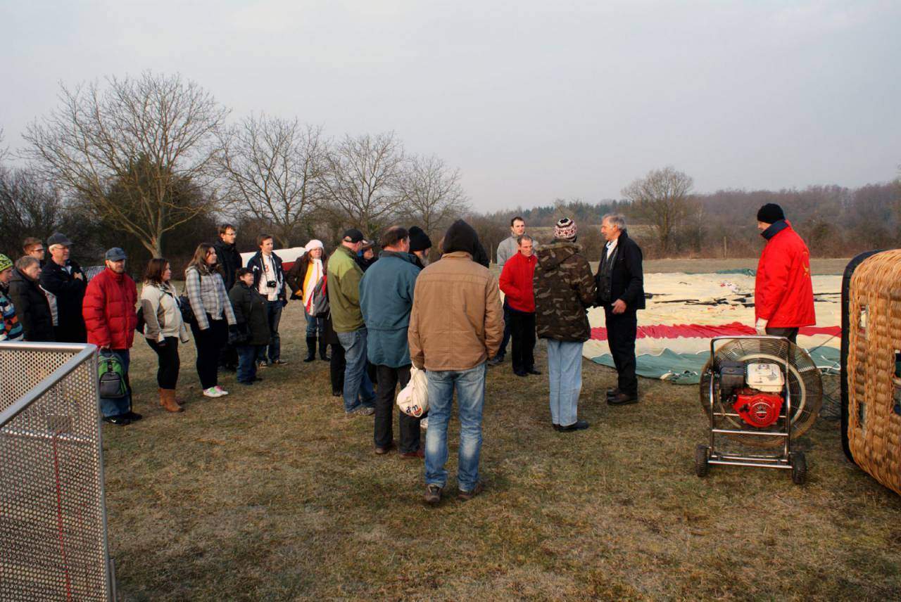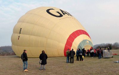 Einen Termin für eine Ballonfahrt zu finden, war also viel schwieriger als den für eine Hausbootfahrt, auch wenn diese länger ist und weiter entfernt stattfindet. Da beim Ballon nur die Höhe und die Geschwindigkeit des Aufsteigens oder Sinkens etwas gesteuert werden kann, nicht aber die seitliche Bewegung, ist es für Fahrer und Teilnehmer immer etwas ungewiss, wo die Reise denn tatsächlich hingeht. Steht der Wind still, tut dies auch der Ballon. Es gab aber auch Tage, so erzählte es Fritz Klank, da wurde er hunderte Kilometer abgetrieben und landete irgendwo in der Schweiz. Dort musste ihn ein Kollege, mit welchem er stets in Funkkontakt steht, mit Geländewagen und Anhänger abholen. Bedingt durch den langen und nassen Winter mussten also unsere ersten beiden geplanten Starttermine verschoben werden. Erst am Sonntag, den 31. März, erhielten wir den Anruf und die Information, dass das Wetter ausgerechnet am 1. April ideal für eine Fahrt wäre: Kein Regen, kaum Wind, Sonnenschein!