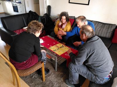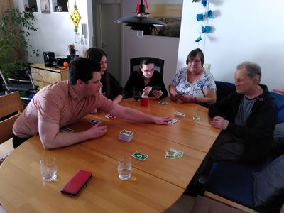 Nachdem die 4 anwesenden Leos und 4 Bewohner bei angeregten Gesprächen ihre Teller leer gegessen hatten, ging es in den Hauptteil über: erbittert (nicht wirklich) wurde um den Sieg bei diversen Gesellschaftsspielen gekämpft. Anhänger von Skippo und Mensch-Ärgere-Dich-Nicht kamen voll auf ihre Kosten, die Stimmung war gut und (fast) jeder konnte mit einem Sieg punkten.