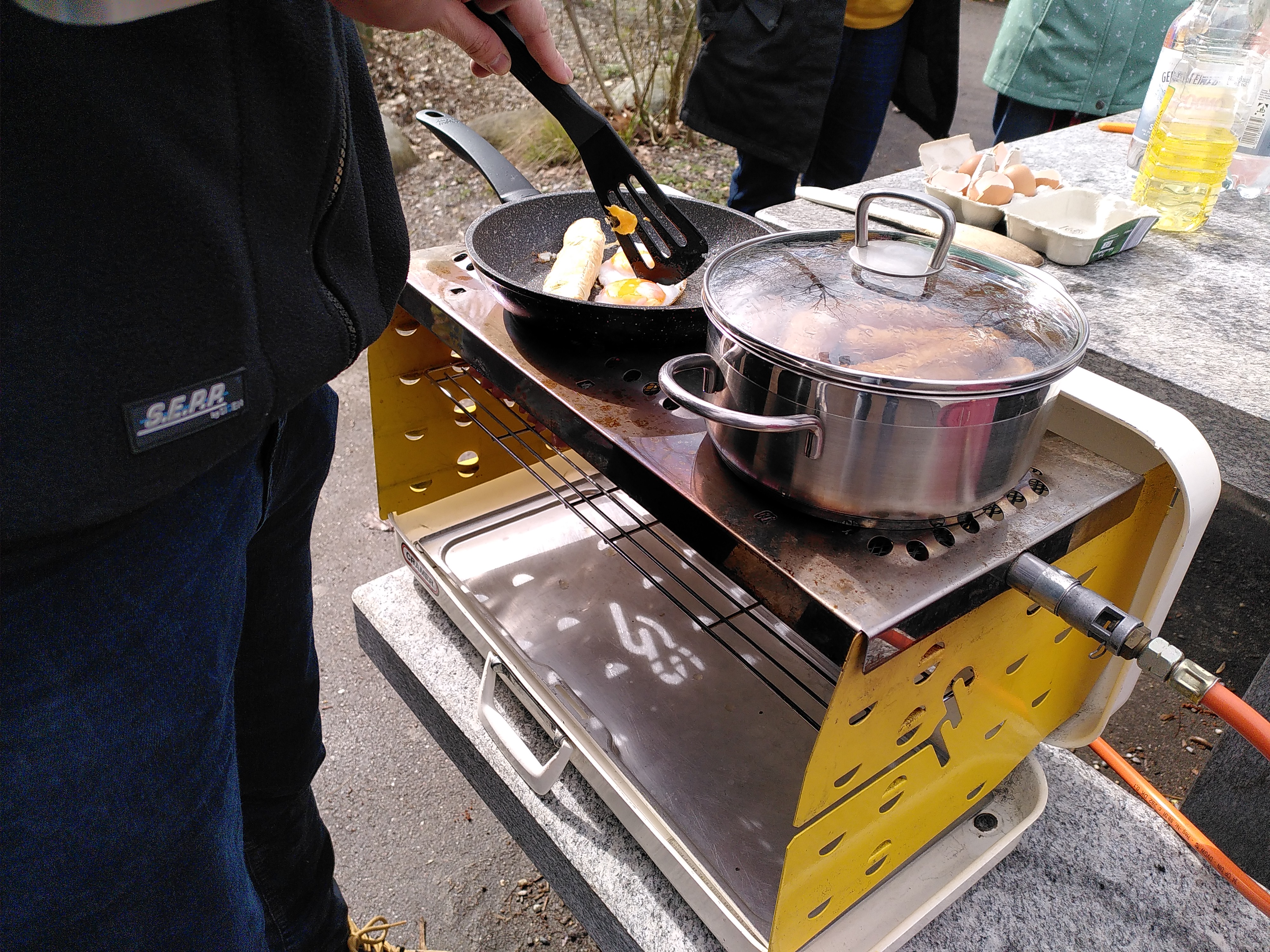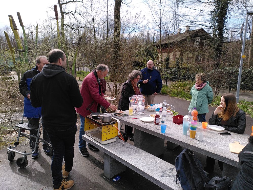 Für das leibliche Wohl sorgten frisch gegrillte Klöpfer, Eier und Brötchen, welche wir mit einem mobilen Gasgrill im Essbereich des Parks zubereiten und bei netten Gesprächen essen konnten. Glücklicherweise spielte das Wetter in dieser verregneten Jahreszeit mit, sodass der Grill und damit die Stimmung nicht abgelöscht wurden. Im Gegenteil, vereinzeilt beglückte uns sogar die Frühlingsonne und demonstrierte ihre erwachende Stärke.