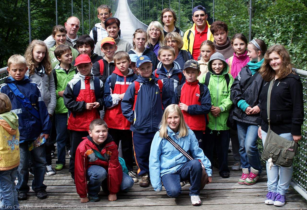Als Nächstes nahm die gesamte Gruppe mehrmals hintereinander im “Gletscherblitz” Platz. Die rasanten Fahrten auf dieser Achterbahn waren ganz nach dem Geschmack der erlebnishungrigen, ausgelassen und sehr laut kreischenden Jugend. Nur den beiden Betreuerinnen ging es offensichtlich viel zu schnell; sie fuhren nur einmal mit. Als “unbeschreiblich schön” bezeichneten die jungen Gäste danach auch die zahlreichen Fahrten im 217 m langen Wildwasserkanal und auf der überdachten, 800 m langen Sommerrodelbahn.Ihr Fazit “Es ist so toll, dass wir so etwas Schönes erleben durften” beschränkte sich nach dem sechsstündigen Aufenthalt im Park nicht nur auf den Spaß in schnellen Fahrzeugen. Auf einem gemeinsamen Rundgang durch den Park beobachtete man gemeinsam viele Tiere. Für Erheiterung sorgte eine frei laufende Ziege, die alle zum Streicheln einlud. Und beim Pfauengehege sorgte die vierzehnjährige Julia vom Leo-Club für ein nettes Intermezzo: Auf ihren auffordernden Pfiff hin schlug ein Blauer Pfau umgehend das Rad.Unterwegs wurde die weltgrößte Erlebnis-Seilbrücke überquert. In der Gruppe fiel es leicht, in 30 Meter Höhe die 218 Meter zurückzulegen. Alle genossen dabei die herrliche Aussicht ohne irgendwelche Anzeichen von mulmigen Gefühlen. Welch eine ungewöhnliche Perspektive: Man fühlt sich “beschwingt” und sieht auf Baumwipfel, auf Sikawild und Wildschweine und auf die beiden Rodelbahnen.