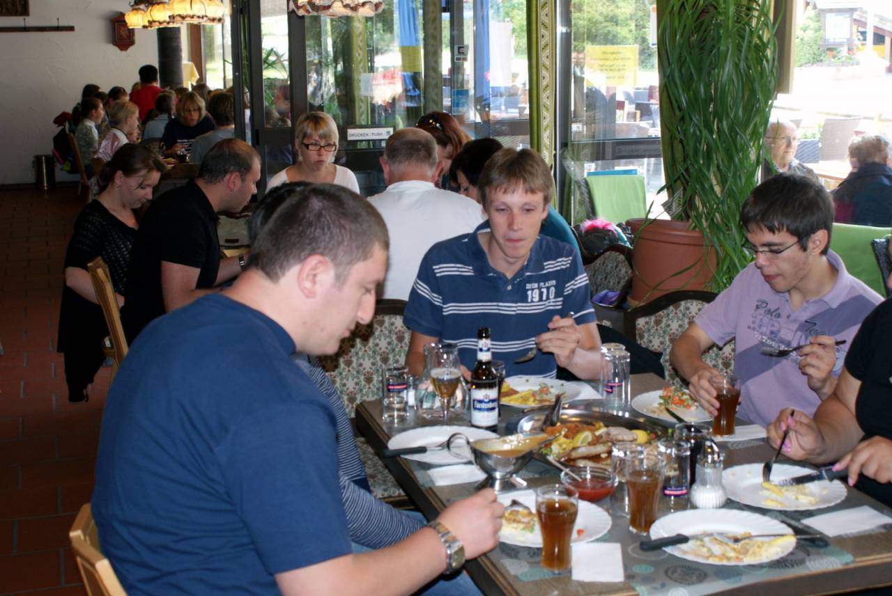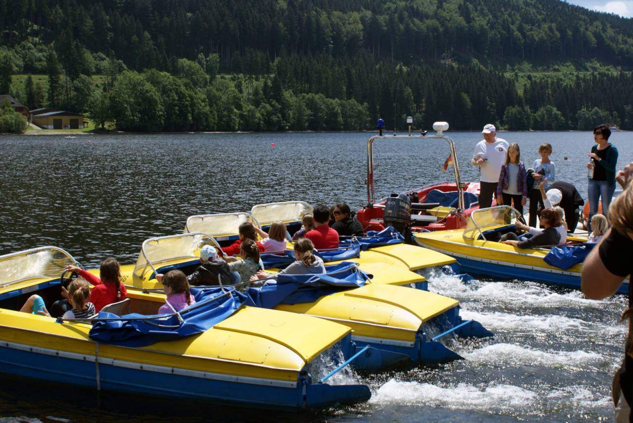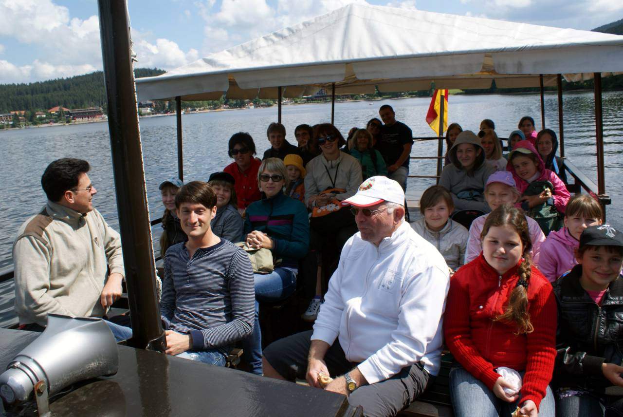 Am Tag darauf folgte ein Tagesausflug mit Bahn und Bus zum Titisee. Die Eindrücke von einer Rundfahrt auf dem Titisee mit der Galeere “Titus”, dem Mittagessen im direkt am See gelegenen empfehlenswerten Restaurant “Zur Mühle” und von einer Tretboot-Rallye hat der neue Clubpräsident Andreas Remdt zusammengefasst:Es war ein besonderer Tag für zehn Kinder aus Weißrussland: Zusammen mit einigen Leos sowie Betreuern des Arbeitskreises Tschernobyl-Waisenkinder ging es zur Rundfahrt und zum Tretbootrennen auf dem Titisee.Dieser idyllisch in den Bergen, 845 Meter über dem Meeresspiegel gelegene Gebirgssee, besiedelt mit einem malerischen Kurort, hat viel zu bieten. So fuhren wir nach unserer Ankunft sogleich mit einem Ausflugsschiff über den an einigen Stellen 40 Meter tiefen See, während wir mit allgemeinen und interessanten Details über das Gewässer informiert wurden. Nach dieser Rundtour hatten wir eine kleine Stärkung nötig, so kam das Restaurant “Zur Mühle” uns doch sehr gelegen. Einen herzlichen Dank müssen wir dabei einem Mitglied vom Lions Club Titisee aussprechen: Herr Peter Drubba schenkte uns die Rundfahrt auf dem Titisee und kam uns auch bei den Kosten für das grandiose Essens sehr entgegen. Respekt und Dankeschön!