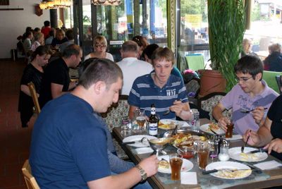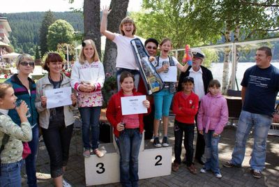 Frisch gestärkt ging es zurück zu Strand und Steg, jedoch wollten wir uns dieses Mal nicht nur durch die Gegend fahren lassen, sondern selber aktiv werden. Was bot sich da mehr an, als ein Tretbootrennen zu veranstalten? So bildeten sich gut gemischte Teams, bestehend aus drei Personen, – zwei sehr aktiven Leuten, welche kräftig in die Pedale treten mussten und dabei noch auf den richtigen Weg zu achten hatten und einer dritten Person, welche hinten saß und, nun ja, mehr zum Anspornen und Motivieren dabei war… Gefahren wurde mit fünf Tretbooten auf einem mit Bojen abgesteckten Kurs. Nach zwei Vorläufen fiel die Entscheidung in einem bis zum Schluss spannenden Finale der besten sechs Teams.Die zehn Ferienkinder zeigten bei dieser Wassersportübung ebenso wie die vier Russisch sprechenden Mädchen aus Lörrach vollen Einsatz und konnten sich bei der Siegerehrung über einige Preise freuen.