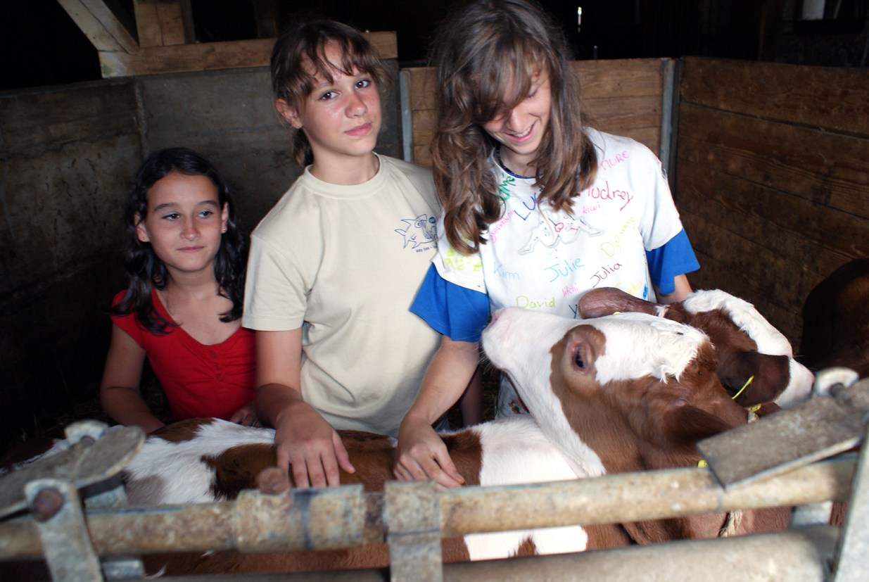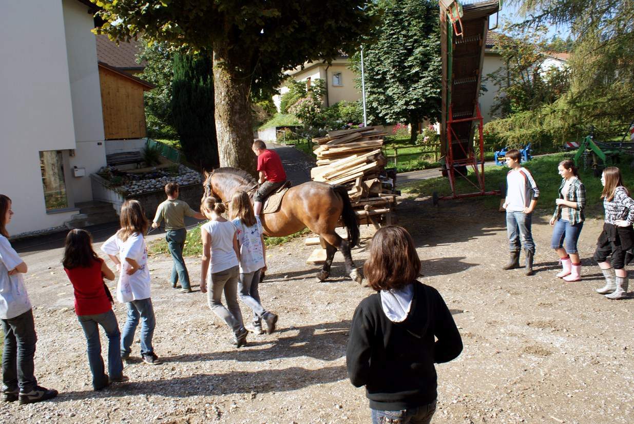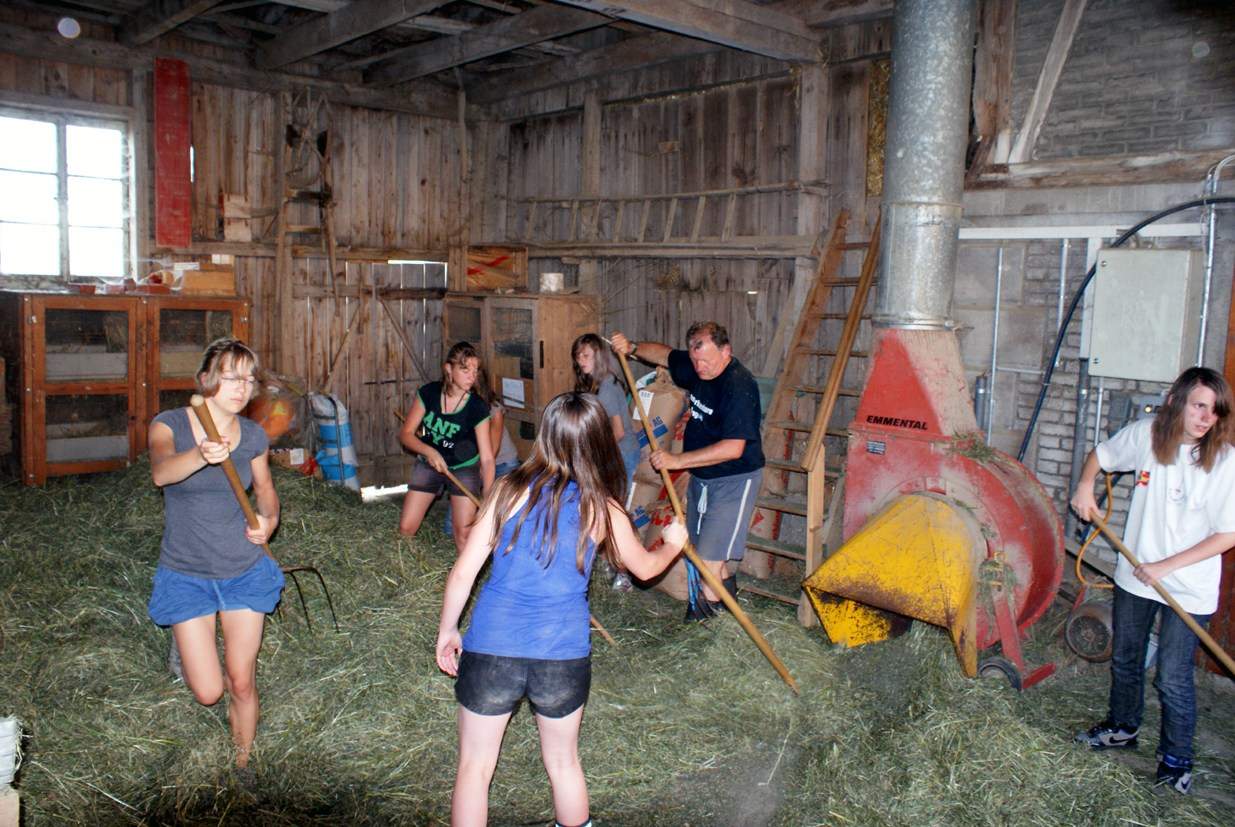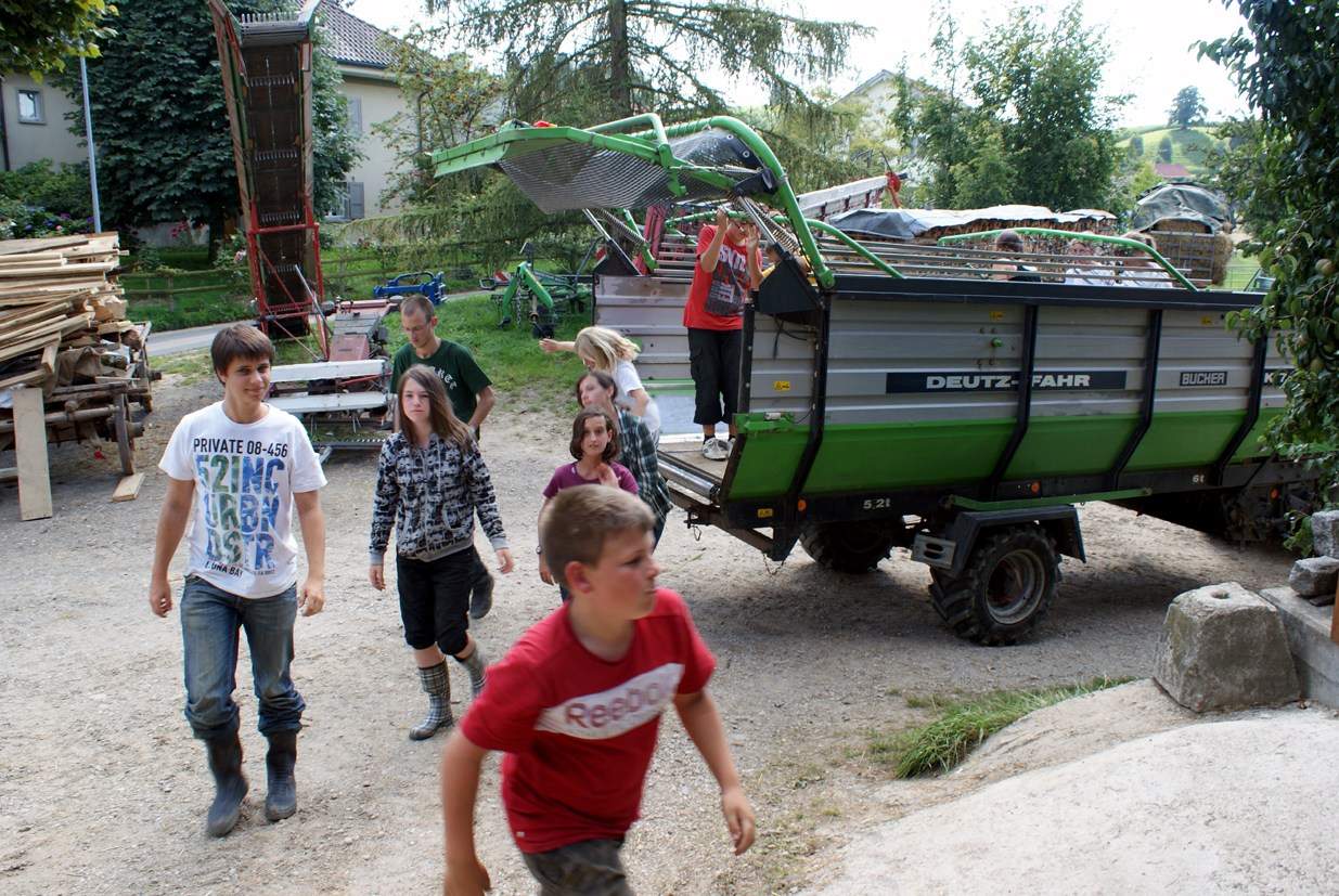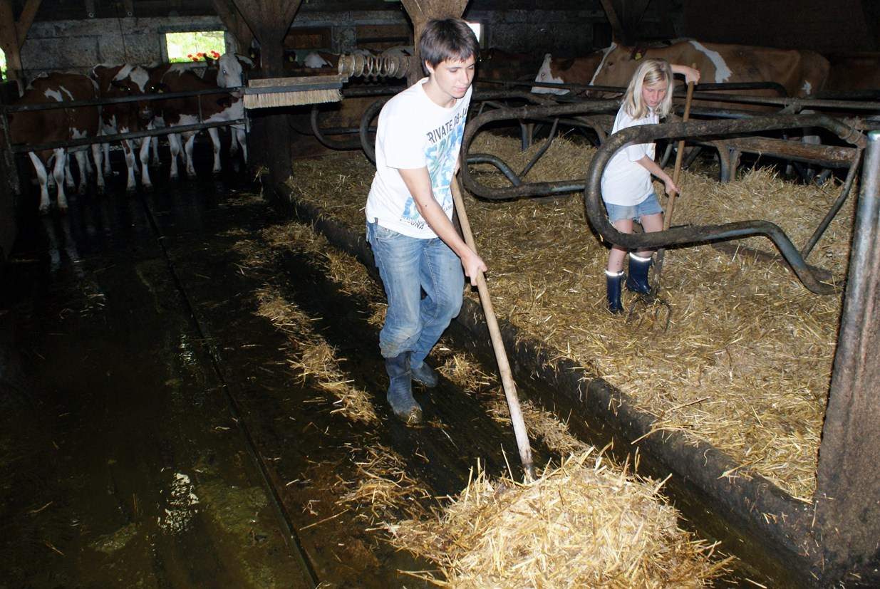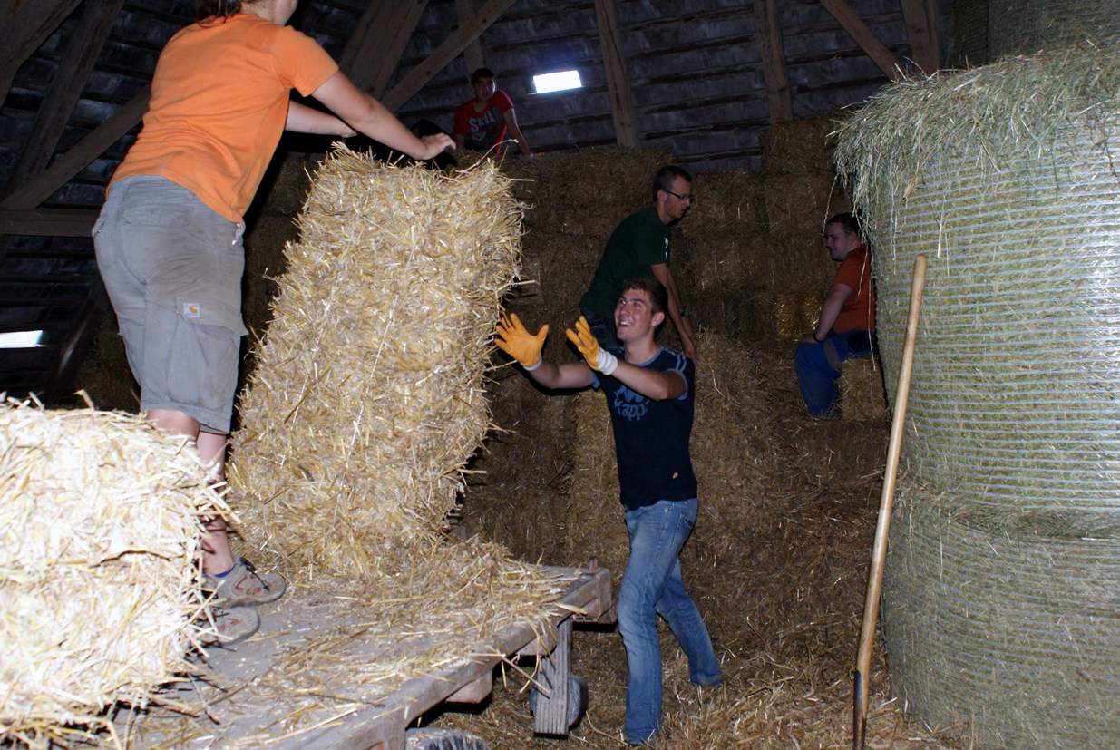 Früh morgens und am Abend war Stallarbeit angesagt. Die Einen hatten Spaß daran, im Melkstand nacheinander 26 Kühe zu melken, Andere machten die Erfahrung, dass das Ausmisten der Ställe eine wahre Knochenarbeit darstellt. Wie selbstverständlich arbeiteten zum Beispiel Jean-Christophe aus St. Louis, Anjuscha aus Wölflinswil und David aus Lörrach zusammen. Und bei allen wuchs der Respekt vor der Arbeit eines Landwirts von Tag zu Tag!Viele Campteilnehmer packten auch kräftig bei der Arbeit auf den Feldern zu. So werden ihnen ihre Mithilfe bei der Stroh- und bei der Kartoffelernte noch lange in Erinnerung bleiben. Ebenso wissen nun alle, wie viel Arbeit es ist, zwischendurch mal schnell fünf Ladewagungen Heu in das Gebläse unter dem Heuboden zu schieben.
