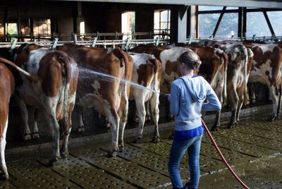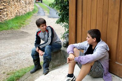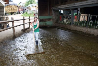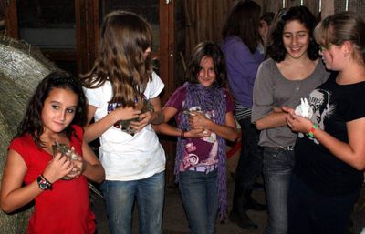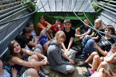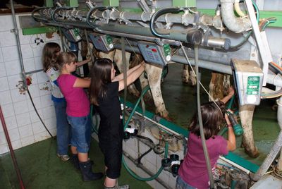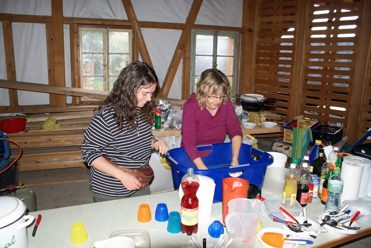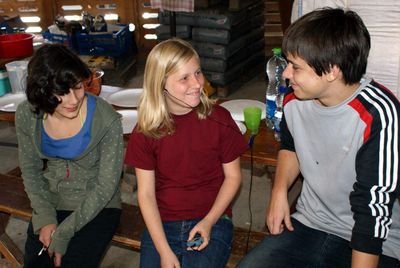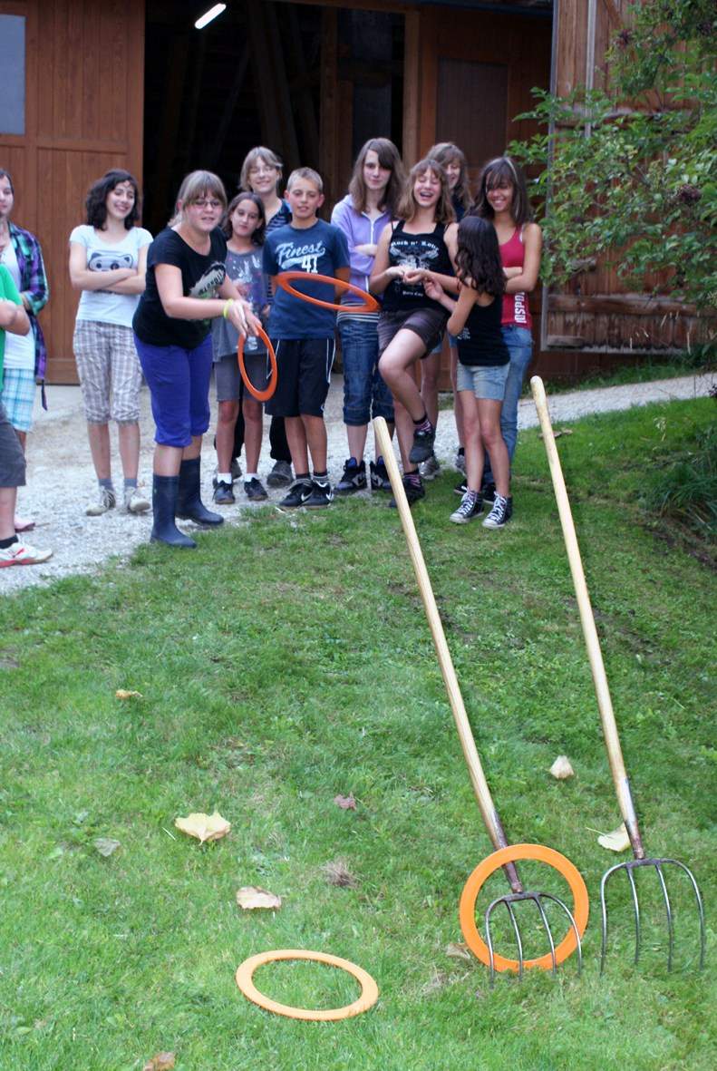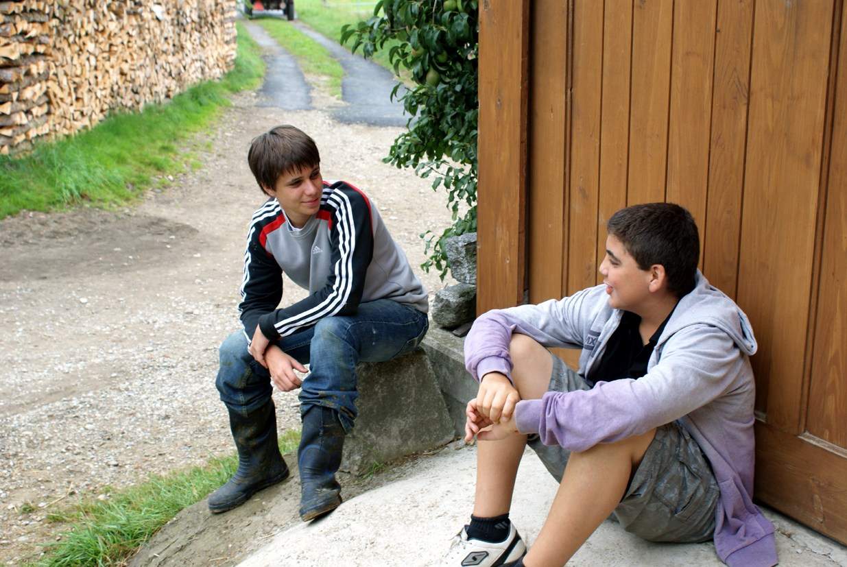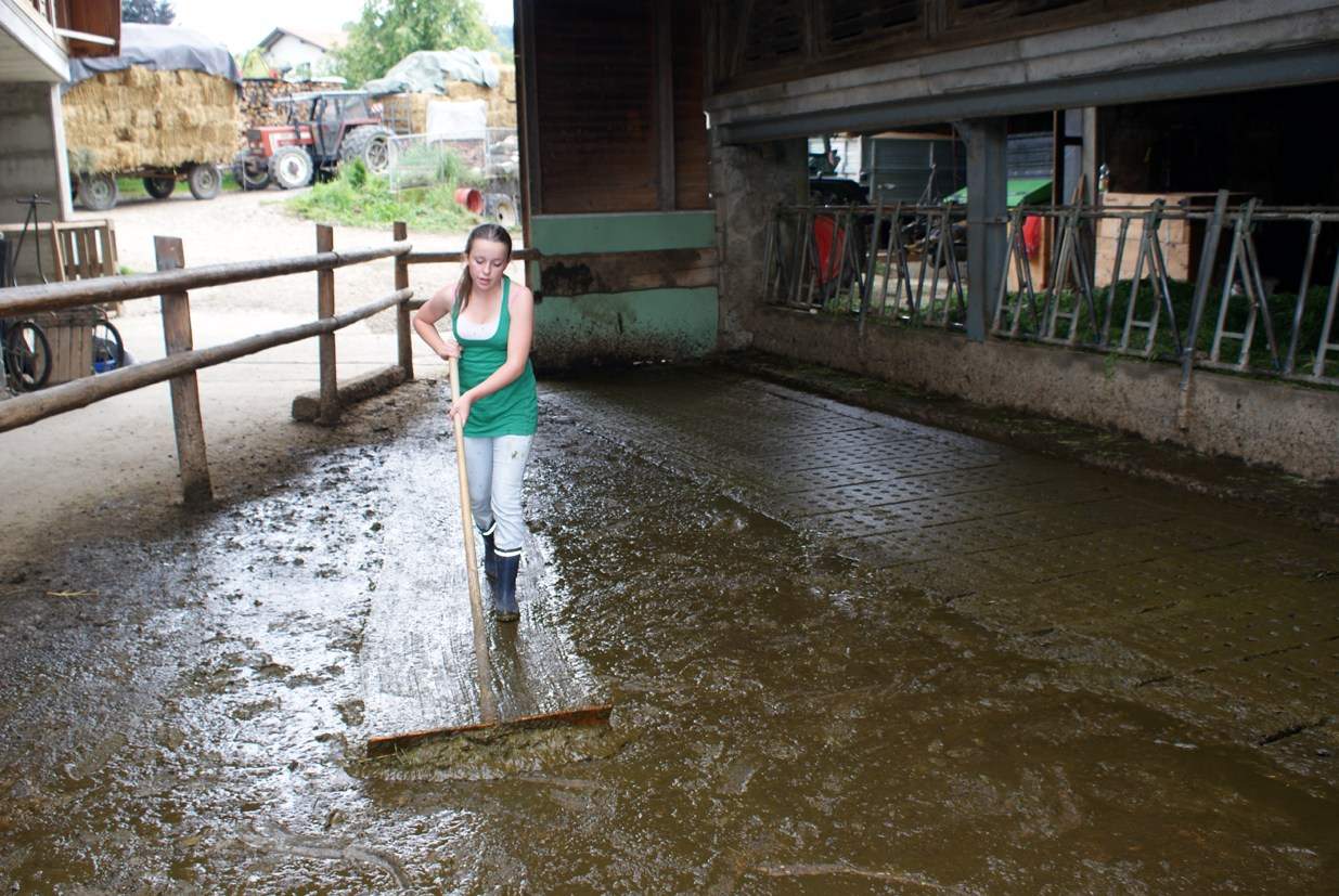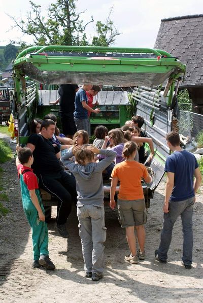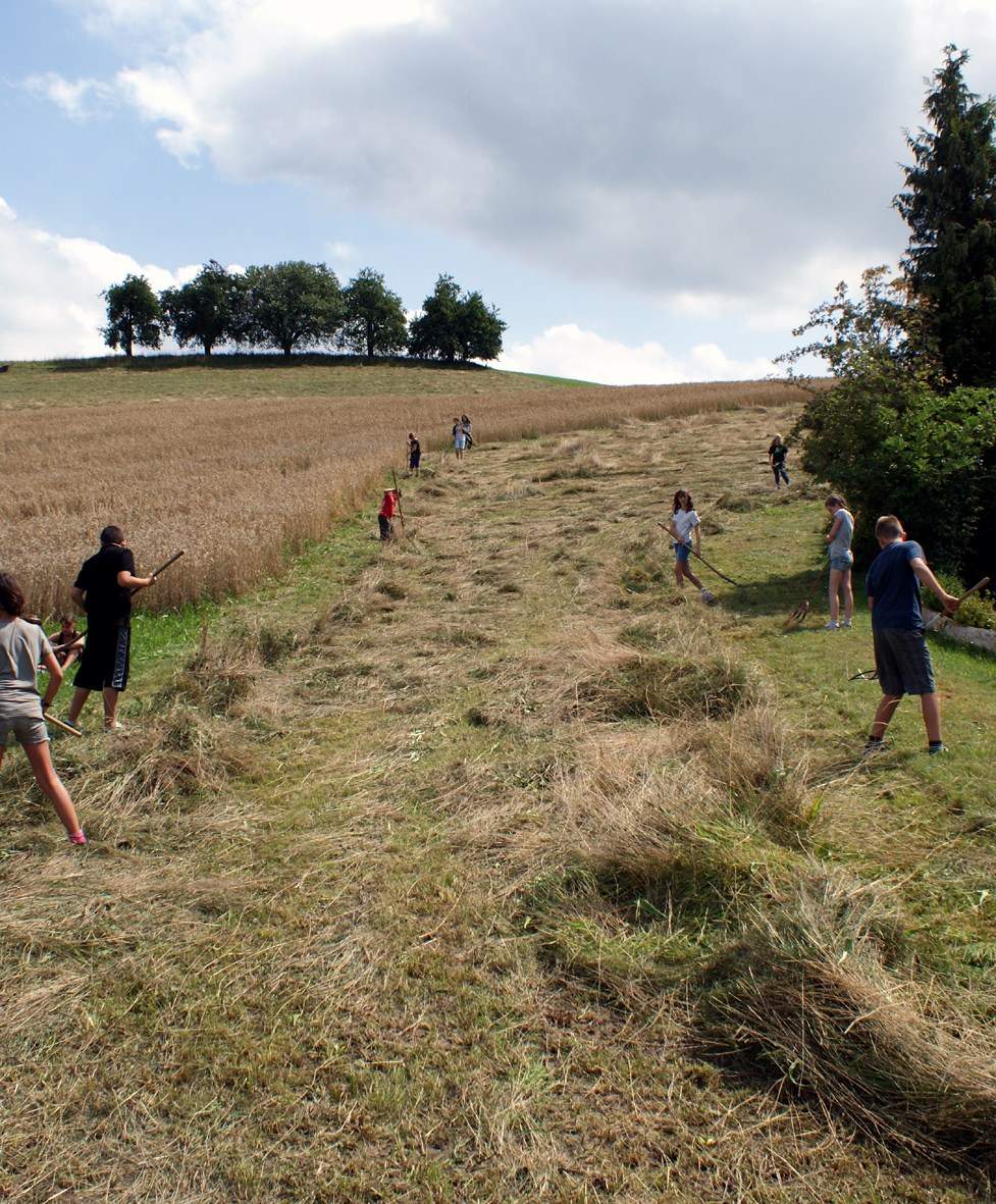 Früh morgens und am Abend war Stallarbeit angesagt. Die Einen hatten Spaß daran, im Melkstand nacheinander 26 Kühe zu melken, Andere machten die Erfahrung, dass das Ausmisten der Ställe eine wahre Knochenarbeit darstellt. Wie selbstverständlich arbeiteten zum Beispiel Jean-Christophe aus St. Louis, Anjuscha aus Wölflinswil und David aus Lörrach zusammen. Und bei allen wuchs der Respekt vor der Arbeit eines Landwirts von Tag zu Tag!Viele Campteilnehmer packten auch kräftig bei der Arbeit auf den Feldern zu. So werden ihnen ihre Mithilfe bei der Stroh- und bei der Kartoffelernte noch lange in Erinnerung bleiben. Ebenso wissen nun alle, wie viel Arbeit es ist, zwischendurch mal schnell fünf Ladewagungen Heu in das Gebläse unter dem Heuboden zu schieben.
