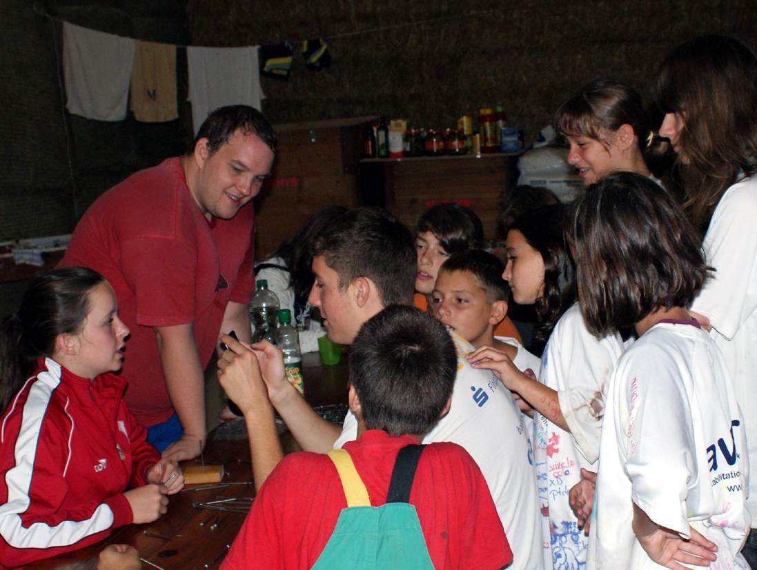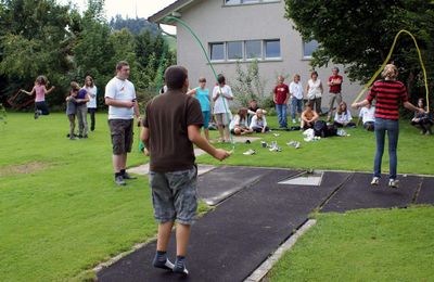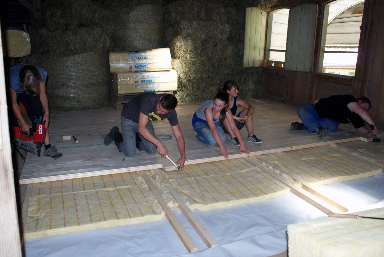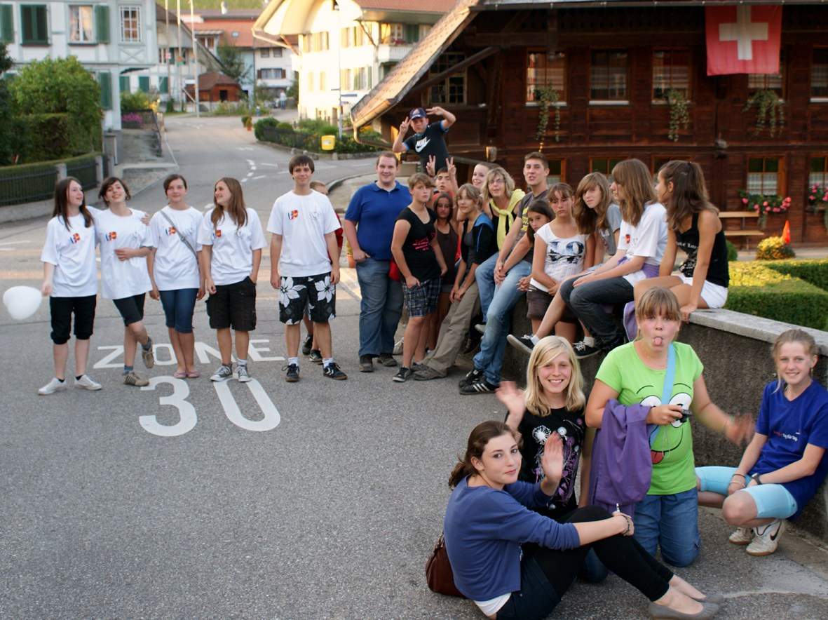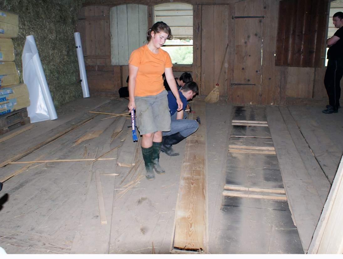 Das Hauptprojekt während des siebentägigen Aufenthalts auf dem Bauernhof bestand darin, den Scheunenboden auf einer Fläche von 50 m² zu renovieren. Unter Anleitung von Leo Peter Zimmermann wurden hundert Jahre alte Holzbohlen entfernt und nach Anbringung von Dämmmaterial durch neue ersetzt.An erster Stelle im Freizeitprogramm stand ein auf fünf Tage verteilter Zwölfkampf. Fünf trinationale Viererteams maßen sich im Aufenthaltsraum auf dem Hof, auf dem benachbarten Sportplatz sowie im Freibad, das am Sonntagnachmittag gemeinsam besucht wurde, in sportlichen Übungen sowie bei Geschicklichkeitsübungen, wie dem Ringe werfen auf Mistgabeln. Am Sonntagmorgen fuhr die Gruppe mit Bussen auf den 1140 m hohen Berg Ahorn, um anschließend eine Stunde lang mit Miet-Trottinettes zurück ins Tal zu fahren. Abends waren alle immer rechtschaffen müde. Symptomatisch für die Gefühlslage vieler Campteilnehmer war eine Feststellung von Yusuf aus der 6a der Theodor-Heuss-Realschule Lörrach: “Ich hab’ so viel gearbeitet und bin glücklich dabei!” Nur einmal wurde die Nachtruhe umständehalber von 22 Uhr auf 23.30 Uhr verschoben, um bei den Feierlichkeiten zur Bundesfeier am 1. August dabei zu sein. Live dabei war die Gruppe beim nächtlichen Höhenfeuer und beim Feuerwerk auf dem Huttwilberg.
