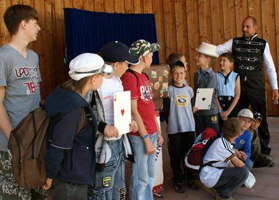 Zum Abschluss des sechsstündigen Aufenthalts im Steinwasenpark besuchte die Gruppe eine Vorstellung des Zauberkünstlers Daniel Bornhäußer. Bei der MAGIC & MYSTERY SHOW baute der Zauberer nach vorheriger Absprache einige Mitglieder der Reisegruppe aus Weil in sein Programm ein. Eine Hauptrolle durfte Volker Hütter, Betreuer vom Arbeitskreis Tschernobyl-Waisenkinder, übernehmen. Und am Schluss standen alle zehn Ferienkinder auf der Showbühne. Auch der nächste gemeinsame Ausflug verspricht viele Abenteuer. Die Leos haben die Ferienkinder nämlich zum Spielen im Kinderland Okidoki in Lörrach eingeladen.