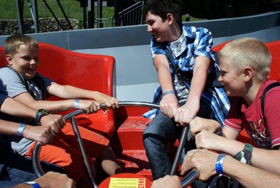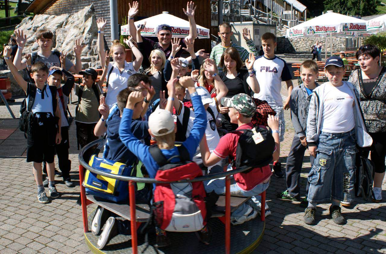 Während der langen Hinfahrt in Zügen und Bussen lernte sich die bunt gemischte Reisegruppe kennen. Dass sich die jungen Gäste aus Weißrussland anfangs recht zurückhaltend zeigten, sollte sich im Steinwasenpark sehr schnell ändern. Plötzlich waren sie nämlich hellwach, als sie sich, zunächst als Co-Piloten, dann aber rasch auch selbstständig, in schnellen „Spacerunner“-Flitzern dem Rausch der Geschwindigkeit hingeben konnten. War das eine Freude!Schnell wurde eine Attraktion nach der anderen entdeckt: In kleinen Teams sauste man in farbenfrohen Rundbooten durch den Wildwasser-Kanal. Und ein ums andere Mal ging’s im Sessellift in beschaulichem Tempo den Berg hinauf und anschließend auf der Rodelbahn ganz rasant runter.Beim gemeinsamen Mittagessen, zu dem die Leos in ein SB-Restaurant eingeladen hatten, wurde eine überaus positive Zwischenbilanz gezogen. Was bisher das Schönste gewesen ist? Die Antwort war eindeutig: Die schnellsten Fahrten, nämlich jene im Gletscherblitz, weil da alle zusammen in einem Zug sitzen und bei 40 km pro h lauthals schreien konnten! Aber auch der Aufenthalt im 4D-Kino war Gesprächsthema. Die wackelnden Sitze und die Wasserspritzer passten so gut zum bizarren Inhalt des Films, einer gar gruseligen Höllenfahrt.
