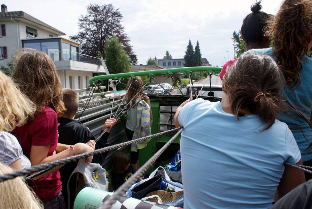 Wir fuhren also in diesem Jahr wieder für eine Woche in die Schweiz. Im Gepäck hatten wir viele Ideen, Spiele und Aufgaben, sodass Langeweile erneut ausgeschlossen war. Baden-Württemberg hat zusammen mit Bayern als letztes deutsches Bundesland Sommerferien. Deshalb starteten wir erst am 28. Juli, zu einem Zeitpunkt also, zu dem die Kinder aus der Schweiz und aus Frankreich auch noch Ferien hatten. Der Reihe nach: Zusammen mit etlichen Kindern aus Deutschland, Frankreich und der Schweiz machte sich Clubbetreuer Gerhard Laux frühmorgens mit dem Zug auf den Weg in das ungefähr 100 Kilometer entfernt gelegene Huttwil, wo er auf einen Großteil der Leos traf. Diese waren bereits mit eigenen Fahrzeugen angereist, hatten den Proviant für die gesamte Woche mitgebracht und allerlei Einrichtungsarbeiten für das Ferienlager auf dem Bauernhof durchgeführt. Rechtzeitig fuhren die Leos mit Traktor und Graslader zum Bahnhof, um die Campteilnehmer bauernhofgerecht abzuholen.