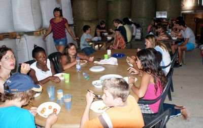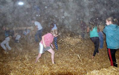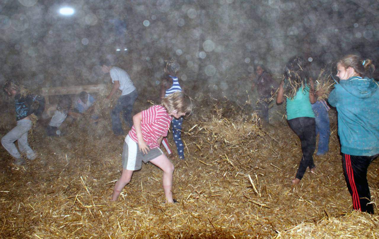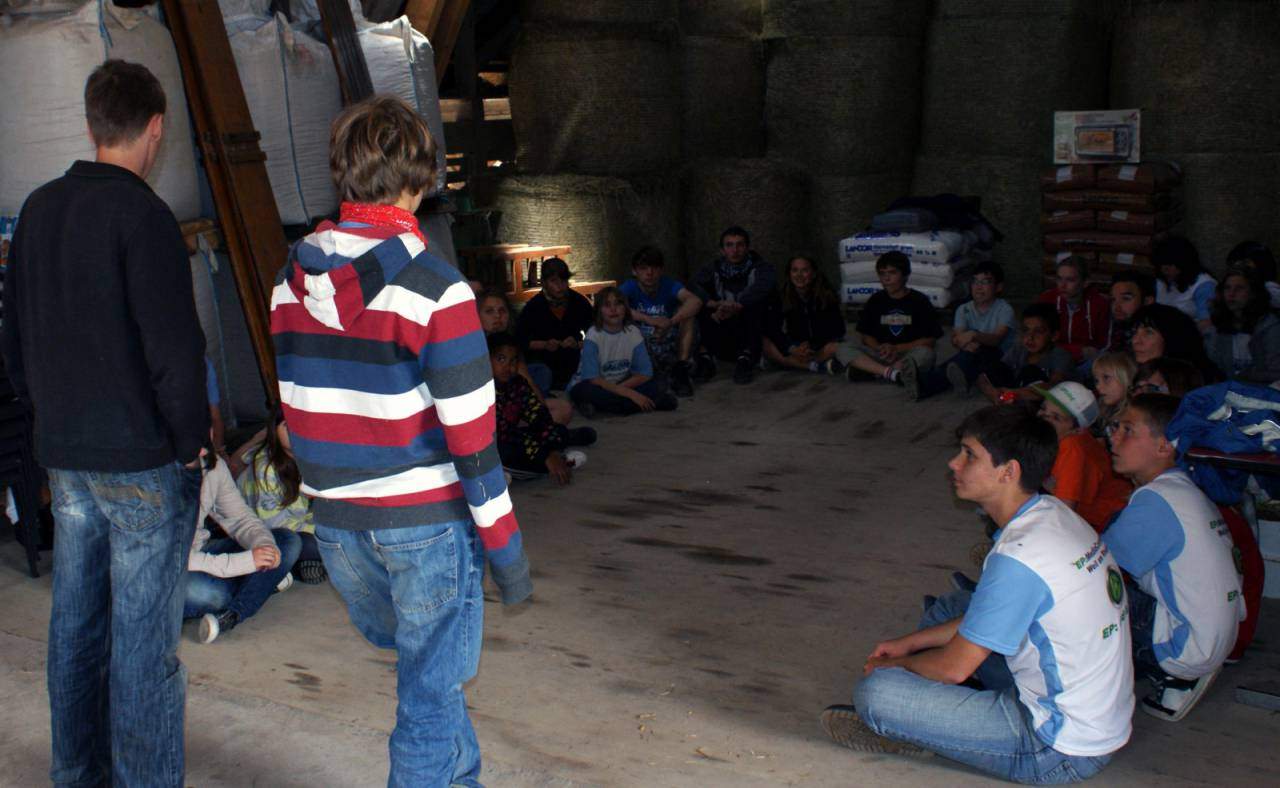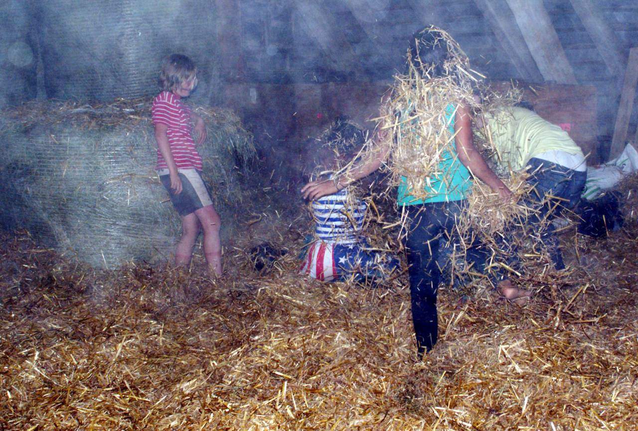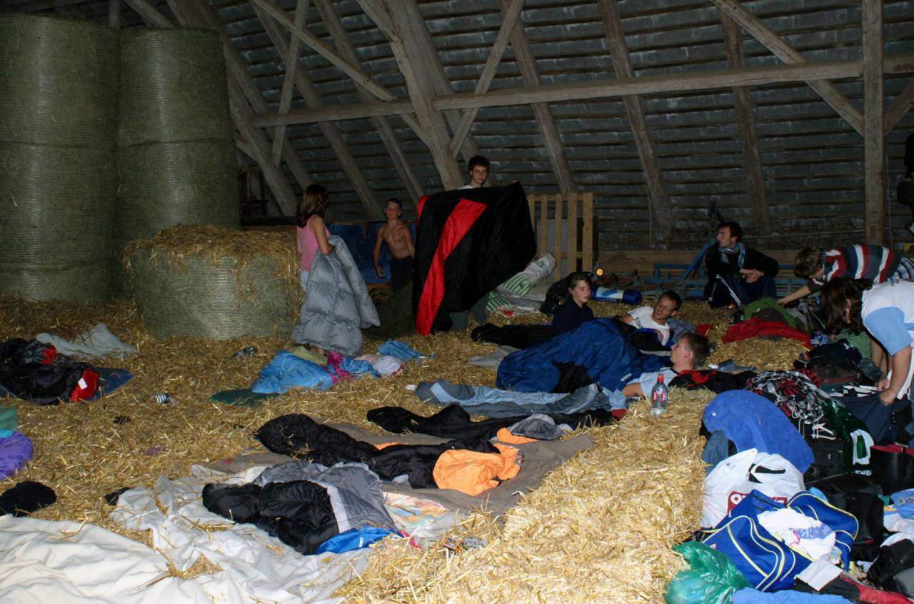 Die Fahrt in dem großen Anhänger war schnell vorüber. Die Kinder stürmten sodann begeistert auf den Bauernhof. Während einige Leos mit den Neuankömmlingen eine kleine Führung durch den großen und teils verwinkelten Bauernhof zum Kennenlernen machten, stellten die anderen das Strohlager fertig. Liebevoll wurden die Schlafplätze ausgestaltet, welche für die nächste Woche für angenehme Nächte sorgen sollten. Als eine dicke und weiche Schicht Stroh auf dem Boden der riesengroßen Scheune verteilt war, konnten alle ihre Schlafsäcke platzieren. Schnell waren die Plätze eingenommen, wobei es neben den Plätzen auf dem flachen Boden auch höher gelegenere und bei einigen Campteilnehmern beliebtere Ecken gab.