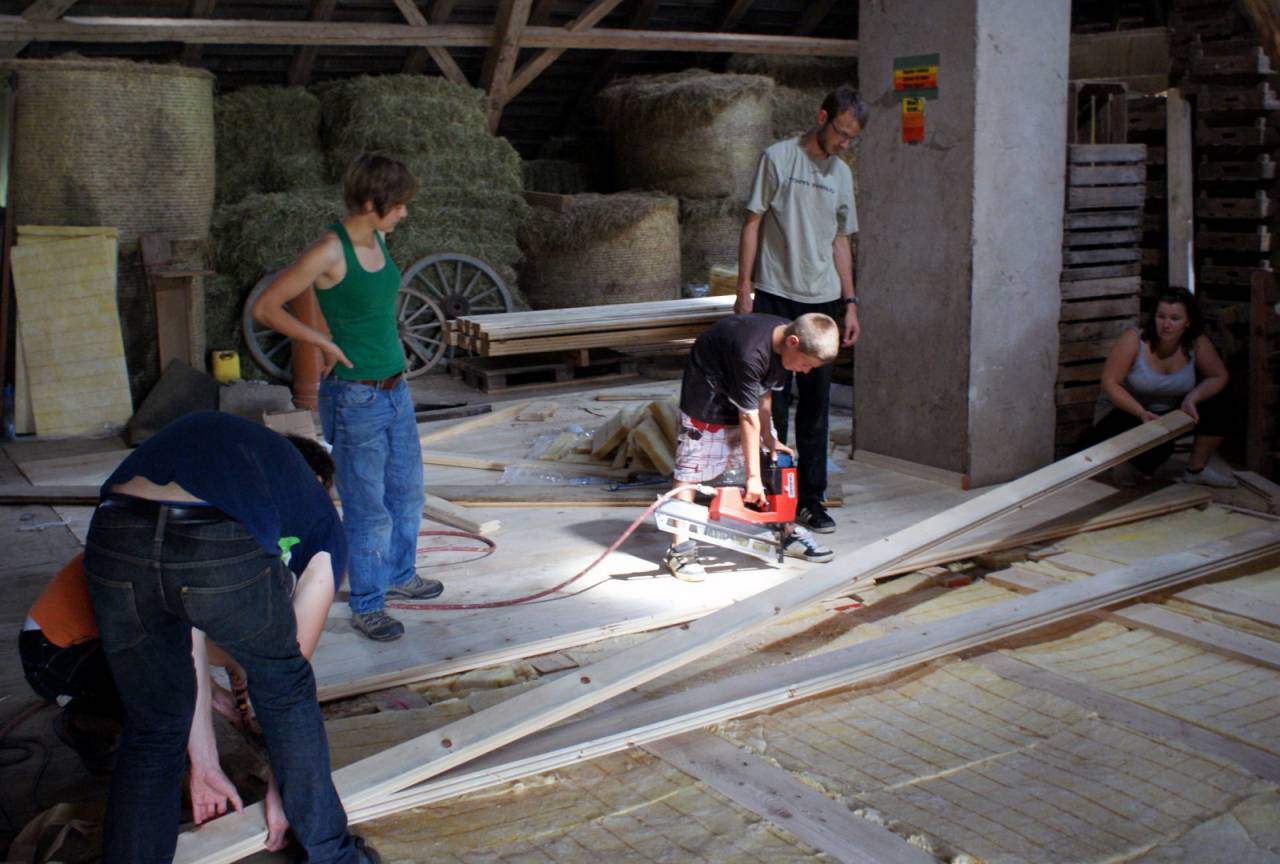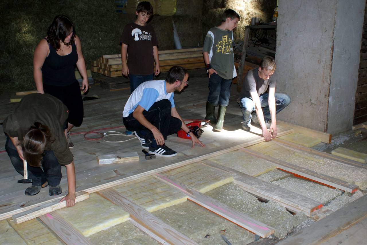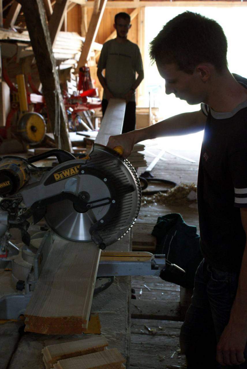 Neben diesen regelmäßig wiederkehrenden Aufgaben gab es auch Spezialprojekte. – So mussten gleich am ersten Tag zwei mit Strohballen beladene Anhänger entladen und die Ballen in einer Scheune gestapelt werden. Das ging an die Substanz und wurde nach einiger Zeit sehr anstrengend. Auch das Verlegen eines neuen Fußbodens in der Scheune war auf Dauer anstrengend, ging aber gut von der Hand. So wurde, wie im letzten Jahr, ein neuer Teil des Scheunenbodens mit frischen Holzbrettern verlegt. Die Bretter mussten vorgeschnitten, ausgemessen, abgesägt, eingesetzt und festgenagelt werden. Eine sehr mühselige Arbeit, welche sich über viele Stunden hinweg zog, aber dank zahlreicher Helfer am Ende erfolgreich und vor allem erstklassig abgeschlossen werden konnte. Auch der gastgebende Landwirt Fritz Mathys war mit der Arbeit sehr zufrieden und zeigte sich erfreut über das Ergebnis.