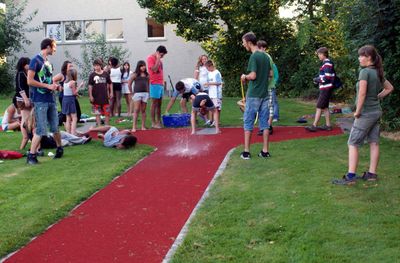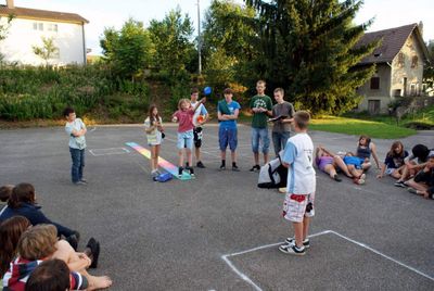 Nach dem ersten Mittagessen wurden dann fünf Gruppen ausgelost. Dies hatte das Ziel, dass die Teilnehmer untereinander mehr zusammen unternehmen und diente der Teambildung beim „Leo-Zwölfkampf“. Bei diesem traten dann die Teams, bestehend aus jeweils fünf Mitgliedern plus Teamchef, gegeneinander an. Am Ende wurde ein Siegerteam gekürt und mit Preisen in Form von kleinen Löwen beschenkt. Der Zwölfkampf zog sich über die gesamte Länge des Sommercamps hin und bot abwechslungsreiche Spiele wie Seilhüpfen, Wasserbombenweitwurf, Mini-Tischfußball oder Ringewerfen. Jeder wurde bei den diversen Übungen sportlich wie auch mental gefordert. Am Ende hatte dann das von Leo Valentin betreute Team die Nase knapp vorne und konnte den ersten Platz für sich entscheiden.