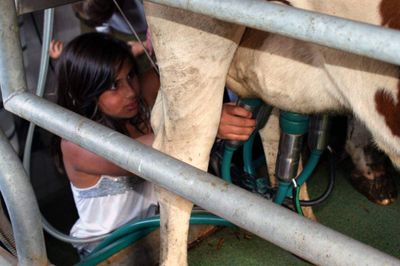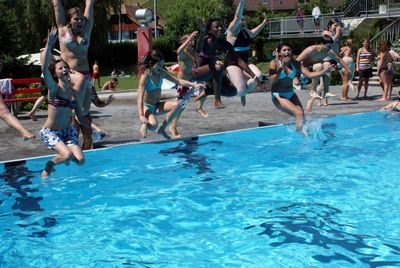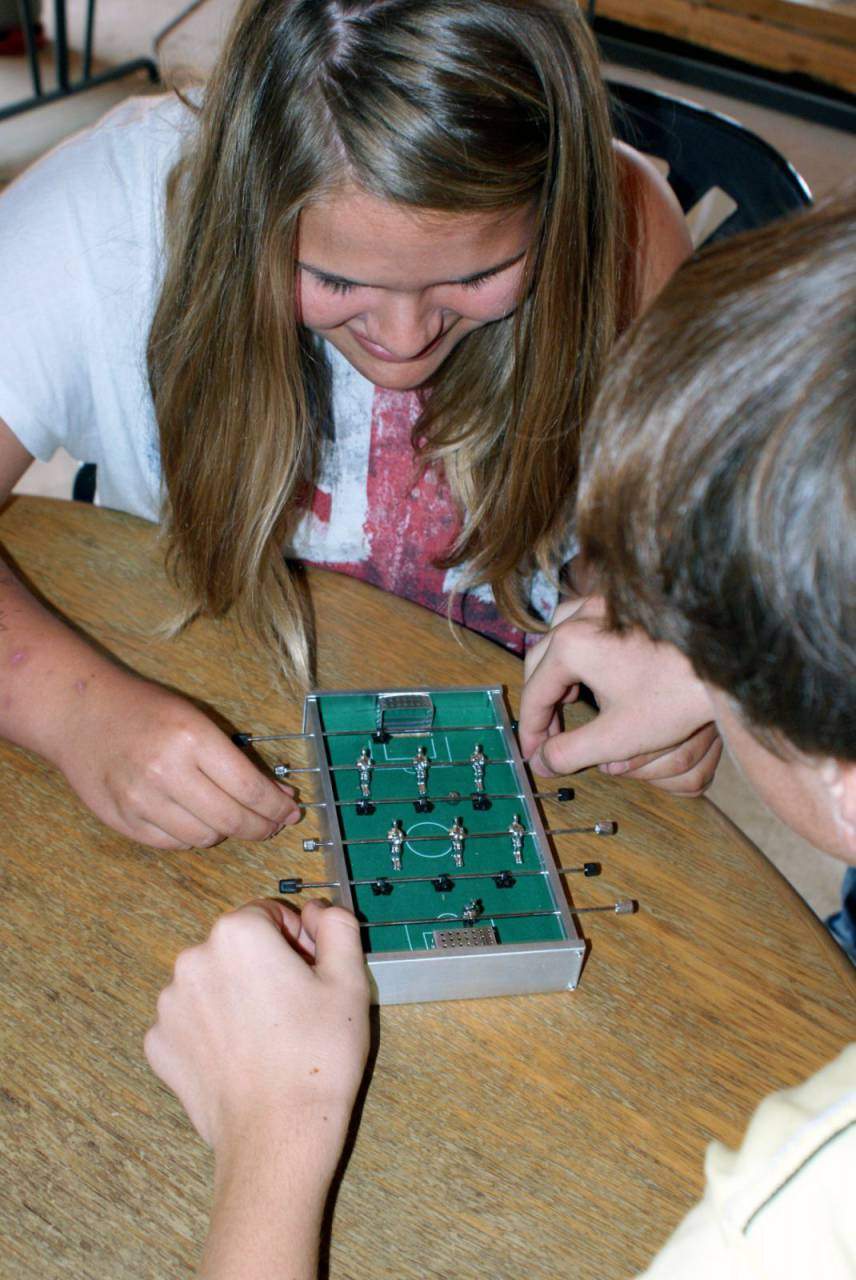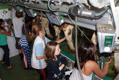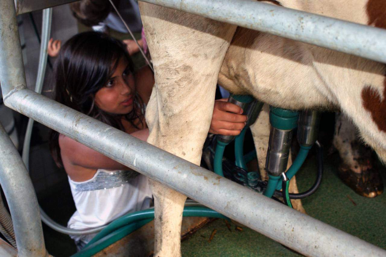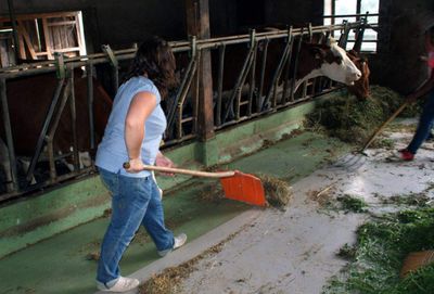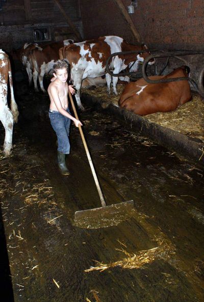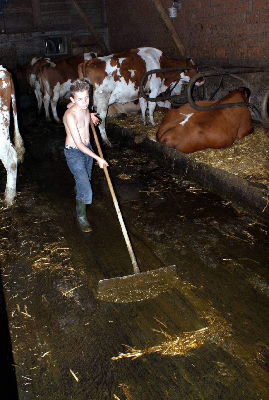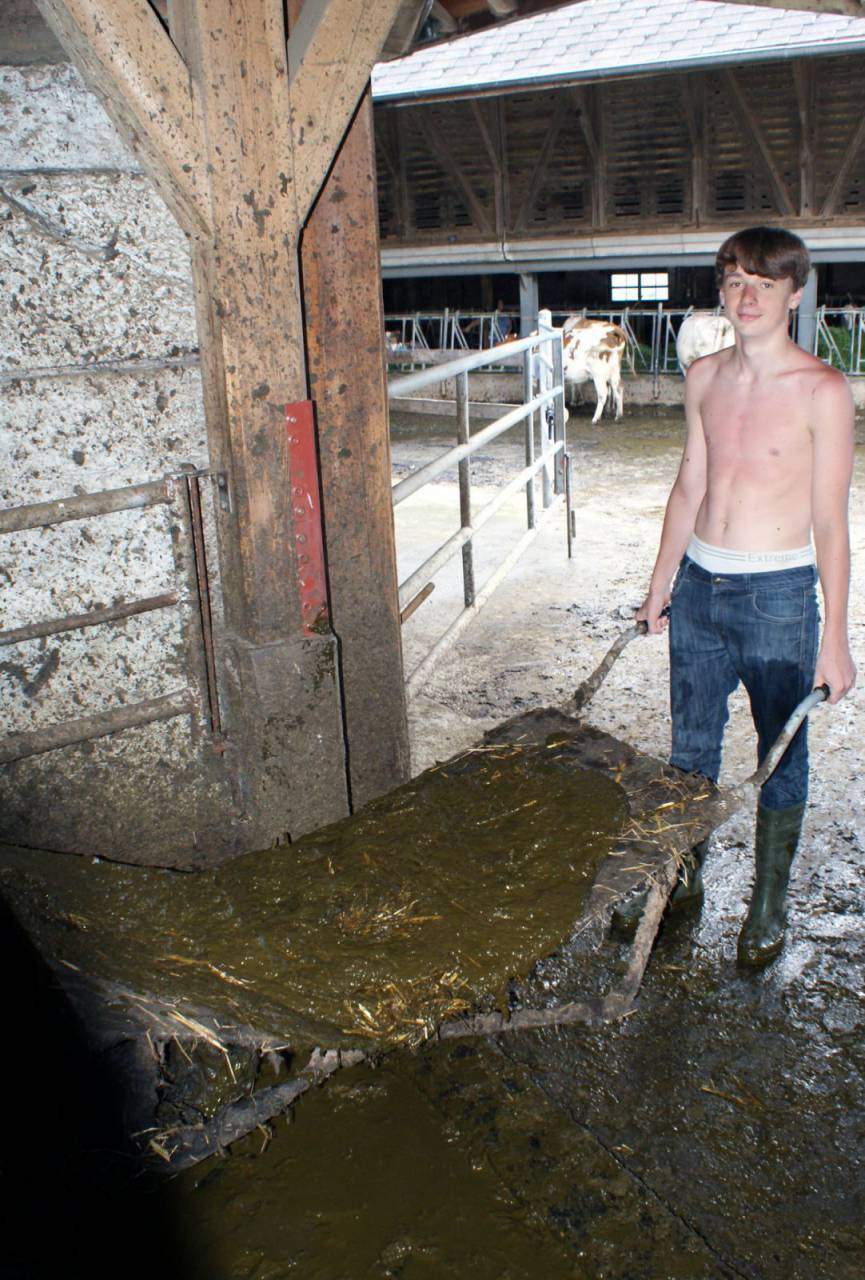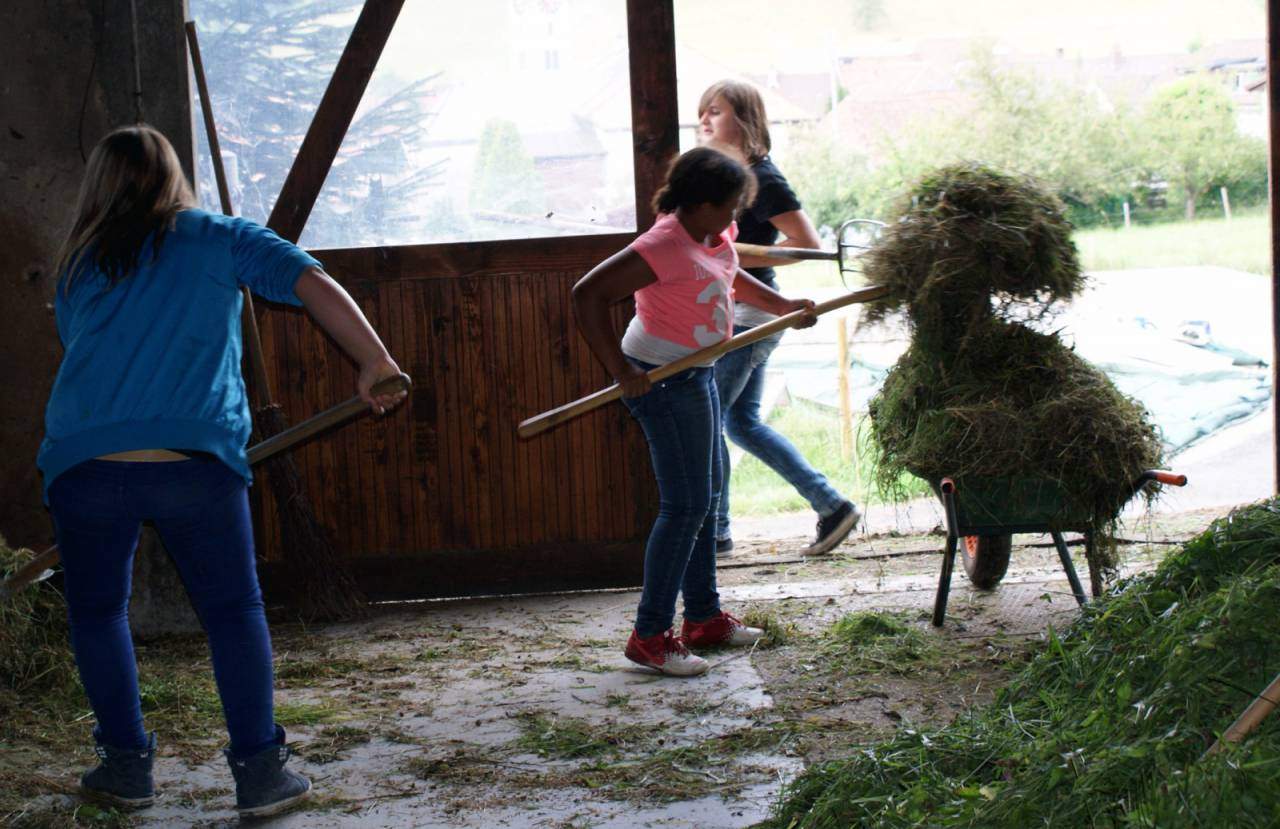 Auch abseits des Bauernhofalltags wurden viele Spiele gemacht, wenn auch nicht immer mir der ganzen Gruppe. Da es einen tollen Sportplatz in Huttwil gibt, wurde hier abends oft Fußball gespielt. Auch ins Schwimmbad ging es insgesamt drei Mal nachmittags. Für die Jüngeren bot der große Bauernhof viel Platz für Verstecken und Fangen, bei welchem es nicht nur auf ein gutes Versteck, sondern auch auf schnelle Reaktion und gute Kondition ankam. Natürlich bestand der einwöchige Aufenthalt nicht nur aus Spiel und Spaß, immerhin gibt es auch viel Arbeit auf so einem Bauernhof. Wie im letzten Jahr hieß es für einige Teilnehmer morgens früh um 5.45 Uhr Aufstehen, um Kühe zu melken und den Stall auszumisten. Dabei teilte man sich in zwei Gruppen auf. – Eine Gruppe übernahm das Melken der Kühe. Auch wenn dies mit weitestgehend automatisierten Maschinen recht schnell von der Hand ging, mussten doch gewisse Vorarbeiten gemacht werden. Etwa das Reinigen der vier Zitzen am Euter und das Vormelken mit der Hand, was bei manchen Kühen eine echte Herausforderung war. Diese waren nämlich manchmal kitzlig und traten mit den Hufen. Allerdings ist nie etwas passiert, auch nicht beim Reinigen des rutschigen Kuhstalls, in welchem jeden Morgen und jeden Abend der Kuhmist mit dem Karren entsorgt und frisches Stroh gelegt werden musste.