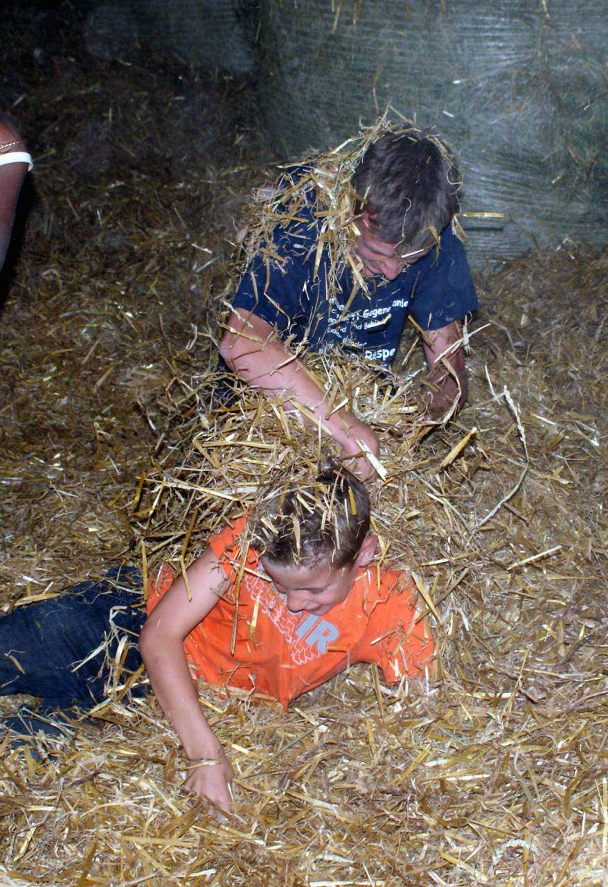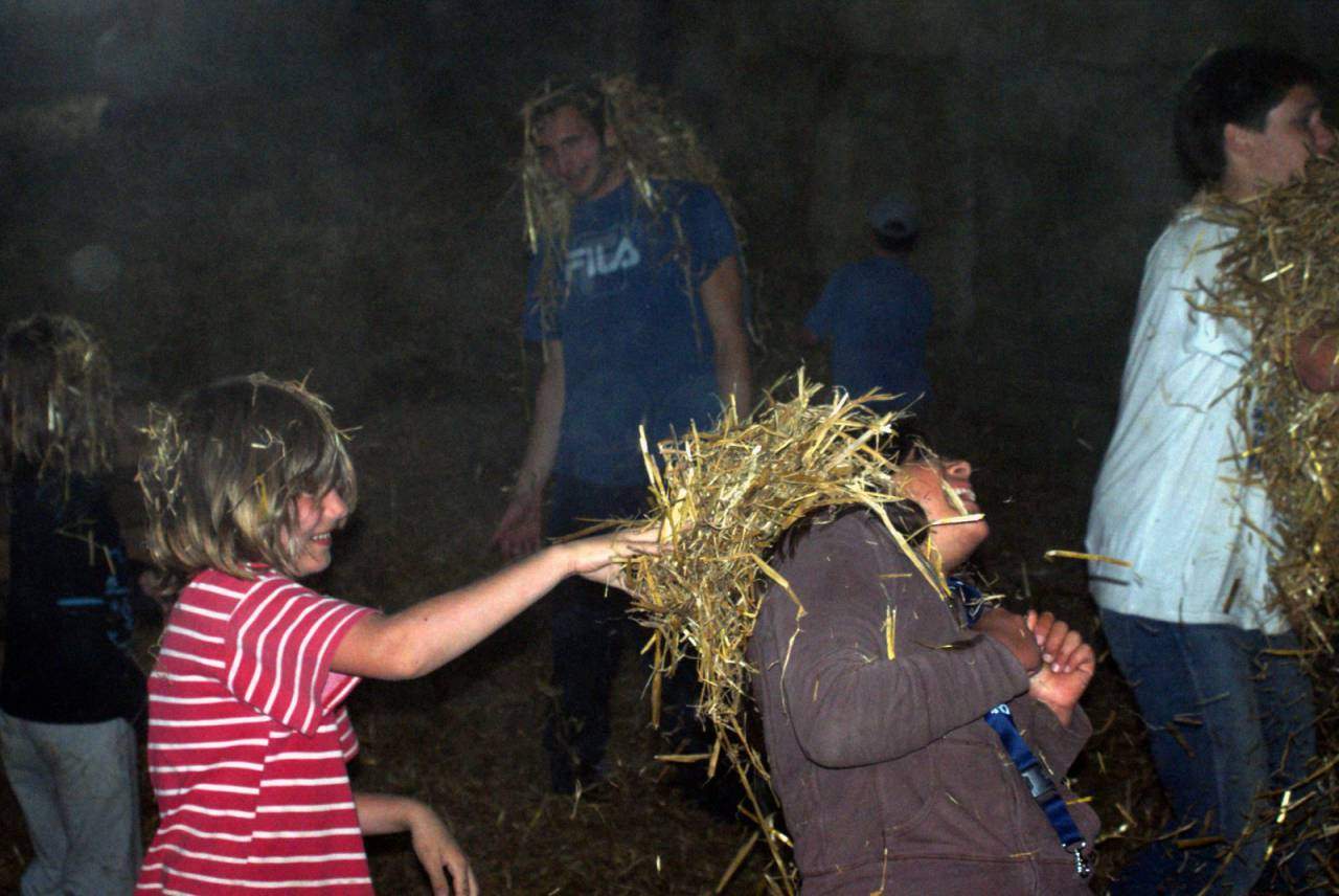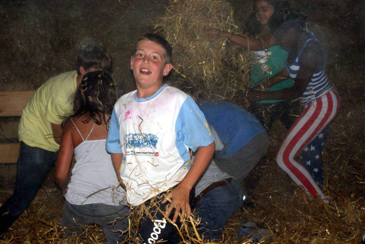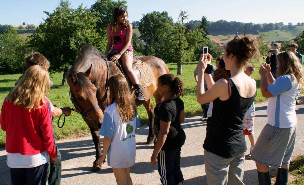 Auch das Reiten auf dem Pferd „Flora“ ließ sich fast niemand entgehen. Zwei große Runden lang musste das Tier nacheinander etwa 30 Leute tragen, wodurch es am Ende sichtlich erschöpft war. Dafür kamen viele Kinder in den Genuss, auf dem Rücken eines großen Kaltblüters zu sitzen und einmal größer als die anderen zu sein. Im Grunde kann man stundenlang über die Erlebnisse in Huttwil erzählen und findet doch immer wieder neue Sachen. Dieser Bericht soll nur einen Eindruck von dem vermitteln, was wir in diesem Jahr erlebt haben. Fakt ist, dass die Zeit unglaublich schnell vergangen ist und viele Teilnehmer gerne noch eine Woche länger dort verbracht hätten. Der letzte Tag wurde gebührend mit einer großen Strohschlacht gefeiert, bei welcher wirklich niemand unverschont geblieben ist. Am Ende befand sich das Stroh wirklich überall, selbst in den Socken kratzte und juckte es. So verabschiedet man sich doch gerne!