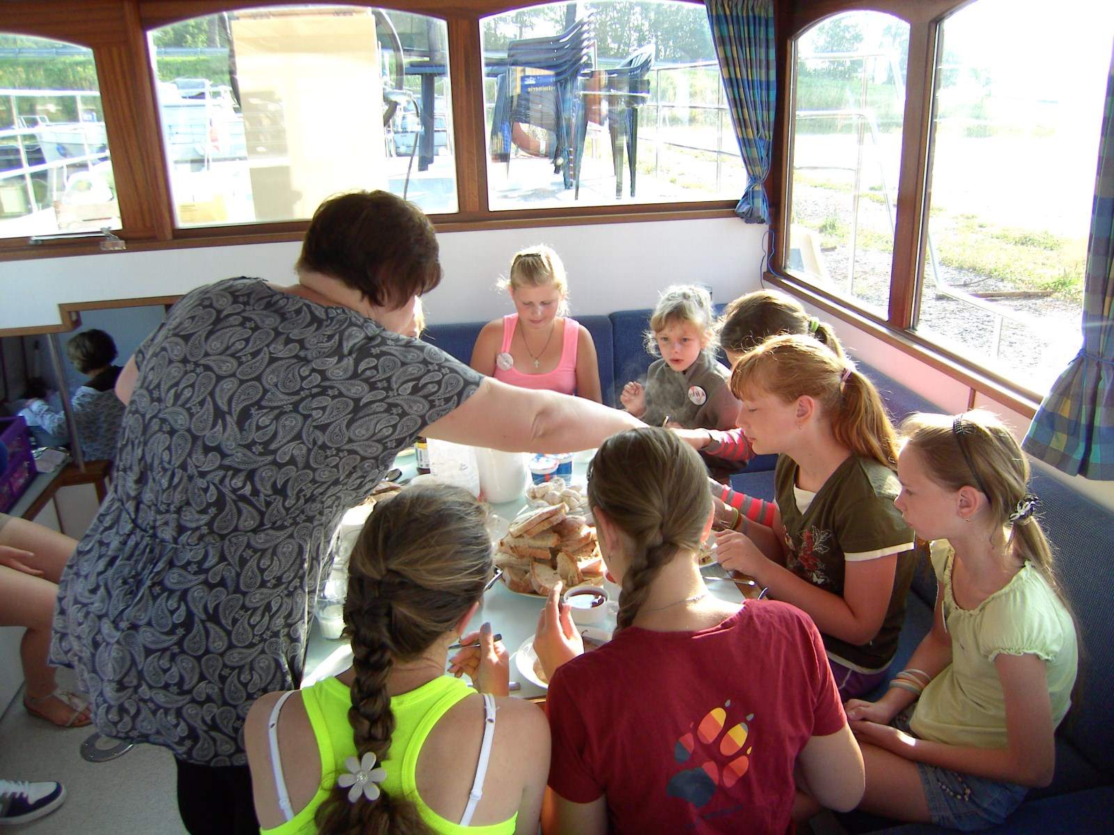 Als am Samstagmorgen die Fahrt auf den beiden großen Hausbooten, einem Kormoran 1280 und einem Kormoran 1500, begann, hatte man schon viel zusammen gespielt, Riesenmikado zum Beispiel oder einige Geschicklichkeitsspiele aus dem vielfach erprobten Leo-Zehnkampf. Sehr schön war es für die Ferienkinder, dass die Leos drei fünfzehnjährige Mädchen russischer Abstammung aus Lörrach mitgenommen hatten. Hoch motiviert und mit viel Liebe kümmerten sich diese um das Wohlbefinden der jungen Gäste, die sich im Übrigen von der ersten bis zur letzten Minute ruhig, aufgeschlossen und überaus höflich gaben.
