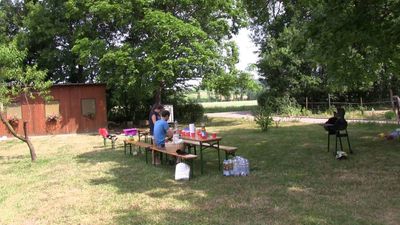 Während der Führung bereiteten wir bereits das Mittagessen vor. Klassisch für Leo-Aktionen wurden frisch gegrilltes Putensteak und Würstchen mit Baguette und Melone als Nachtisch serviert. Doch lange Zeit für die Mittagspause blieb uns und den Kindern nicht, denn der Tag sollte nicht allzu lang werden. Und so ging es rasch mit dem Zehnkampf weiter, welcher verschiedene Disziplinen bereithielt, die die Kinder, aufgeteilt in zwei Teams, gemeinsam absolvieren mussten. Neben sportlichen Aktivitäten wie Catchball oder Slalomlaufen mit aneinandergebundenen Beinen gab es auch einige Denkspiele. So mussten die Kinder möglichst viele Begriffe zum Thema Landwirtschaft nennen oder Gerüche nur mit der Nase erkennen. Zimt und Erdbeere waren übrigens am einfachsten zu erraten.