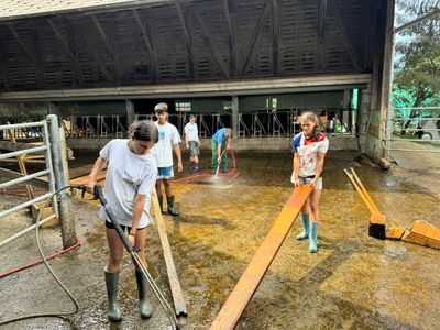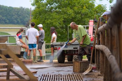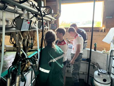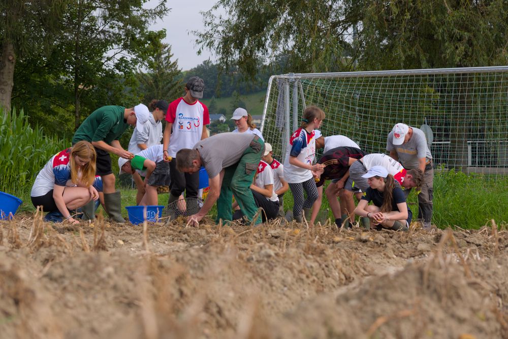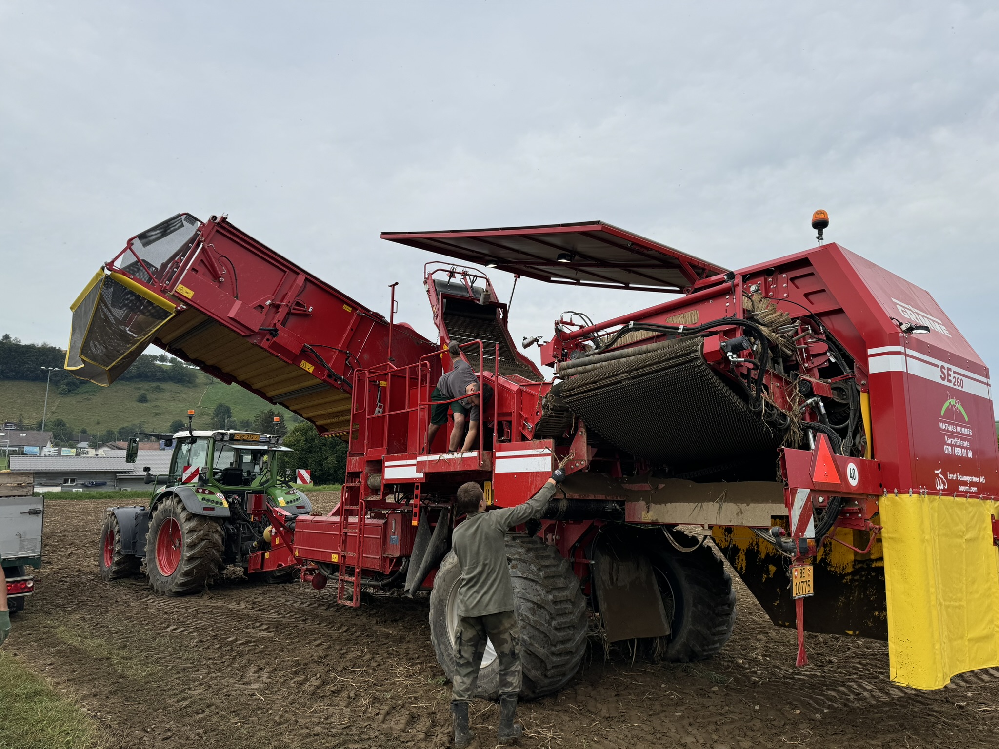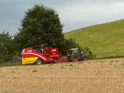 Im Laufe der nächsten Tage erledigten wir die üblichen, anfallenden Arbeiten. Morgens und abends wurden 22 Kühe gemolken sowie deren Stall ausgemistet. Es wurden Strohballen abgeladen und gelagert und das Interieur des Hühnerstalls wurde zerlegt sowie gründlichst gereinigt, um potentiellen Krankheiten vorzukommen. Ein Highlight für viele war die Kartoffelernte am 1. August, welche den ganzen Tag in Anspruch nahm und trotz starken Regens für gute Stimmung sorgte. Auf einer riesigen Maschine, gezogen von einem Traktor, wurden die Kartoffeln aus dem Boden gezogen und auf ein Fließband befördert, welches die Teilnehmer nun in stundenlanger Arbeit überwachen mussten. Die Aufgabe hier lag in der Aussortierung von Steinen, Schmutz, Pflanzen oder schlechten Kartoffeln, sodass nur qualitativ gute Ware in den Kisten landete. Die Anzahl an Kartoffeln war unglaublich und belief sich auf einige Tonnen, welche mit mehreren Anhängern in ein Kühlhaus transportiert werden mussten.