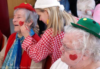 Sophia & Co. hatten eine tolle Aufgabe beim närrischen Nachmittag im Pflegeheim: sie schminkten viele Heimbewohner mit herzigen Motiven.Insgesamt waren acht Leos im Einsatz, einige davon schon früh morgens als Helfer beim Aufbau und Dekorieren der Tischreihen in der Caféteria, andere bis zum Abräumen am Abend.