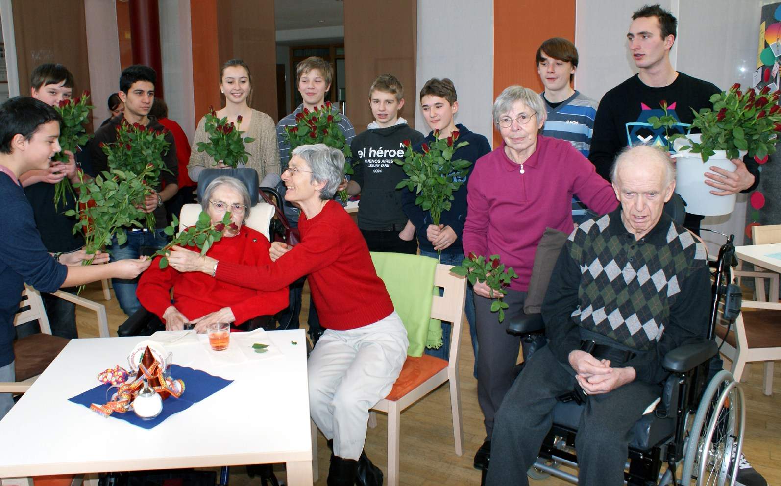 In der Caféteria begannen die Leos am Nachmittag ihren Rundgang durch das Pflegeheim Markgräflerland. Anlässlich des Valentinstags erfreuten die Jugendlichen und jungen Erwachsenen alle Bewohnerinnen und Bewohner, Mitarbeiter und Besucher mit insgesamt 300 roten Rosen.Sechs Mitglieder des Leo-Clubs Weil am Rhein – Dreiländereck freuten sich, dass sie mit Valentin Tesche (ganz rechts) einen Mann mit passendem Namen aufbieten konnten und dass sie an diesem Tag von einer munteren Schar Praktikanten aus der Theodor-Heuss-Realschule Lörrach unterstützt wurden.