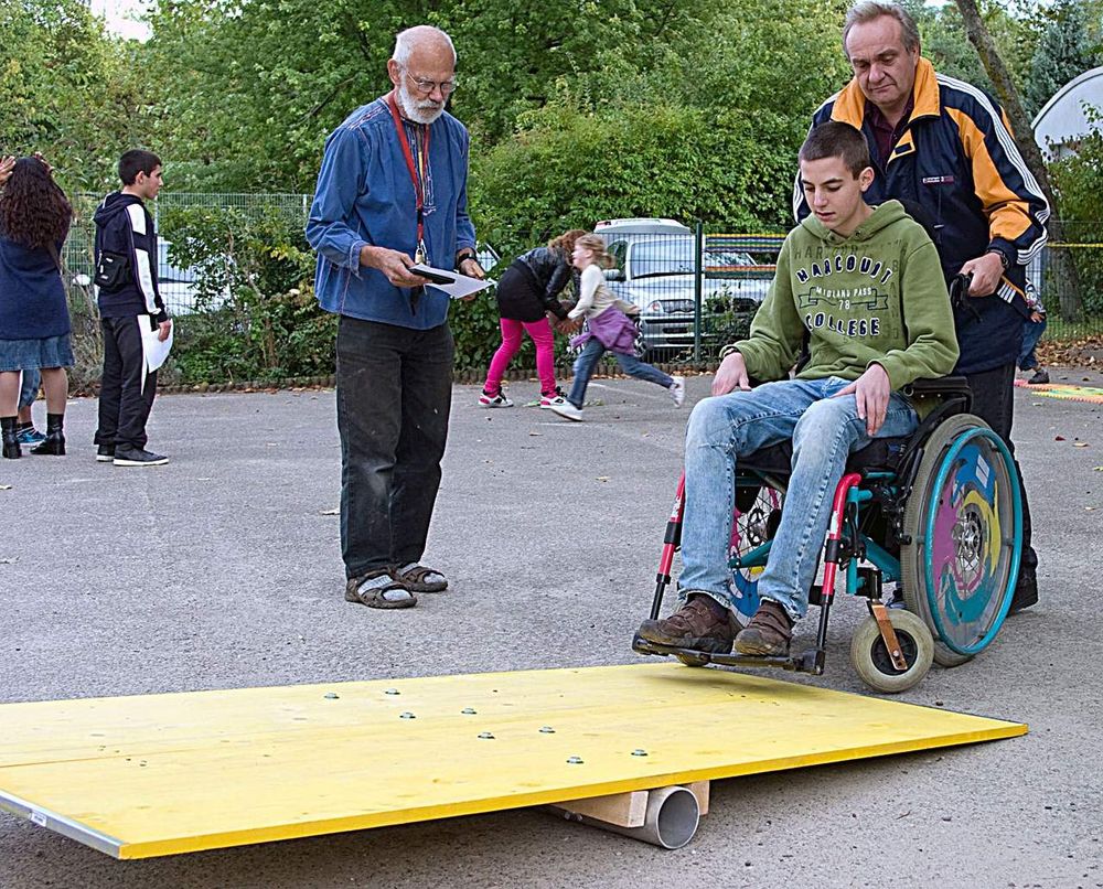 Gemeinsam mit Herrn Robert Schilt, einem früheren Mitglied des Weiler Behindertenbeirats, lassen die Leos ab und zu Festteilnehmer Erfahrungen beim Durchfahren eines Rollstuhl-Parcours machen. – Das Foto zeigt Teilnehmer am “Team-Parcours” beim Generationenfest “Miteinander” in Friedlingen am 26. September 2010.Bei einer dieser Gelegenheiten wurden die Teilnehmer gebeten, einen Fragebogen auszufüllen. Nahezu alle Befragten gaben an, in Zukunft mehr Rücksicht auf Rollstuhl fahrende Personen nehmen zu wollen. Sie schrieben, dass sie durch die eigenen Erfahrungen auf dem Parcours auf Alltagsprobleme dieser Menschen aufmerksam gemacht wurden. Einige repräsentative Aussagen:
