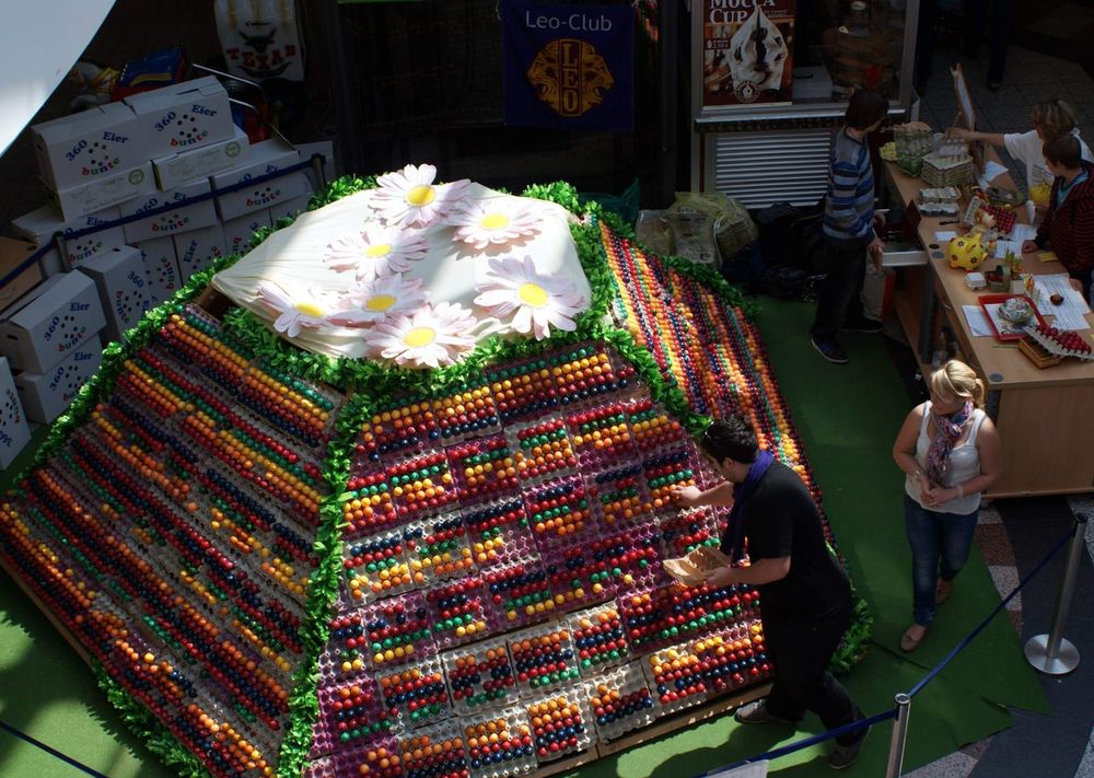 Unglaubliche 12.000 Ostereier, gestapelt auf einer 1,80 Meter hohen Pyramide inmitten eines belebten Einkaufszentrums im Dreiländereck Deutschland-Frankreich-Schweiz. Klingt vielversprechend? Absolut zu Recht, auch wenn sich dieses Spektakel jährlich zu Ostern wiederholt. Denn jedes Jahr, passend zu einer der schönsten Zeit des Jahres, verkaufen wir, der Leo-Club Weil am Rhein – Dreiländereck, all diese von der Werbegemeinschaft Rhein Center gestifteten Ostereier, optisch verziert auf einer großen Holzpyramide.