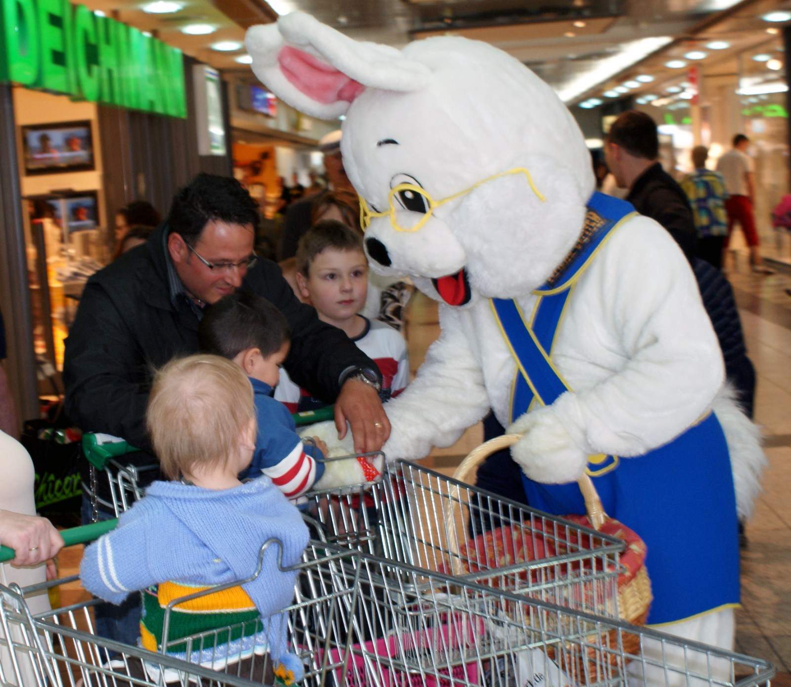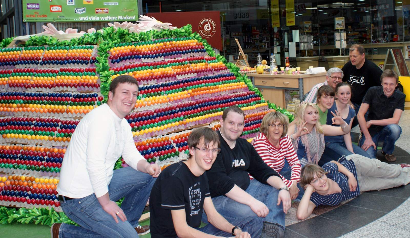 Dabei gab es einen besonderen Grund, viele Eier zu kaufen, denn so stieg die Chance auf einen attraktiven Gewinn doch um einiges. Denn unter 100 Eiern verbargen sich Nummern. Zog der Käufer eines dieser Eier aus der Pyramide oder ließ es von den fleißigen Verkäufern ziehen, so gewann er einen 20€-Einkaufsgutschein, gültig in allen Geschäften des Rhein Centers. Dieser mögliche Gewinn war ein zusätzlicher Ansporn für viele, doch noch das eine oder andere Ei zu kaufen. Und auch wenn es nicht geklappt hatte – das Osterwochenende war gerettet.
