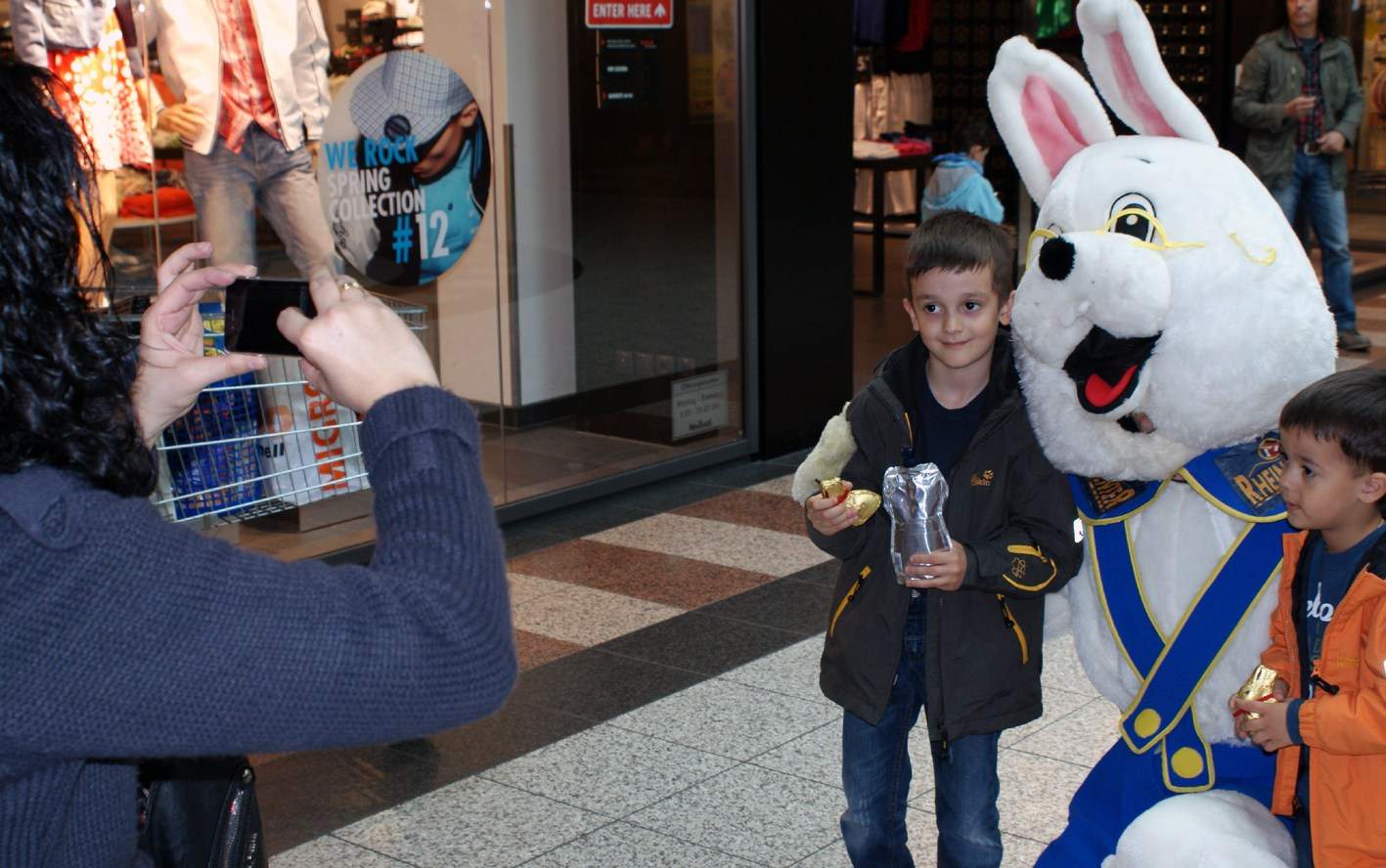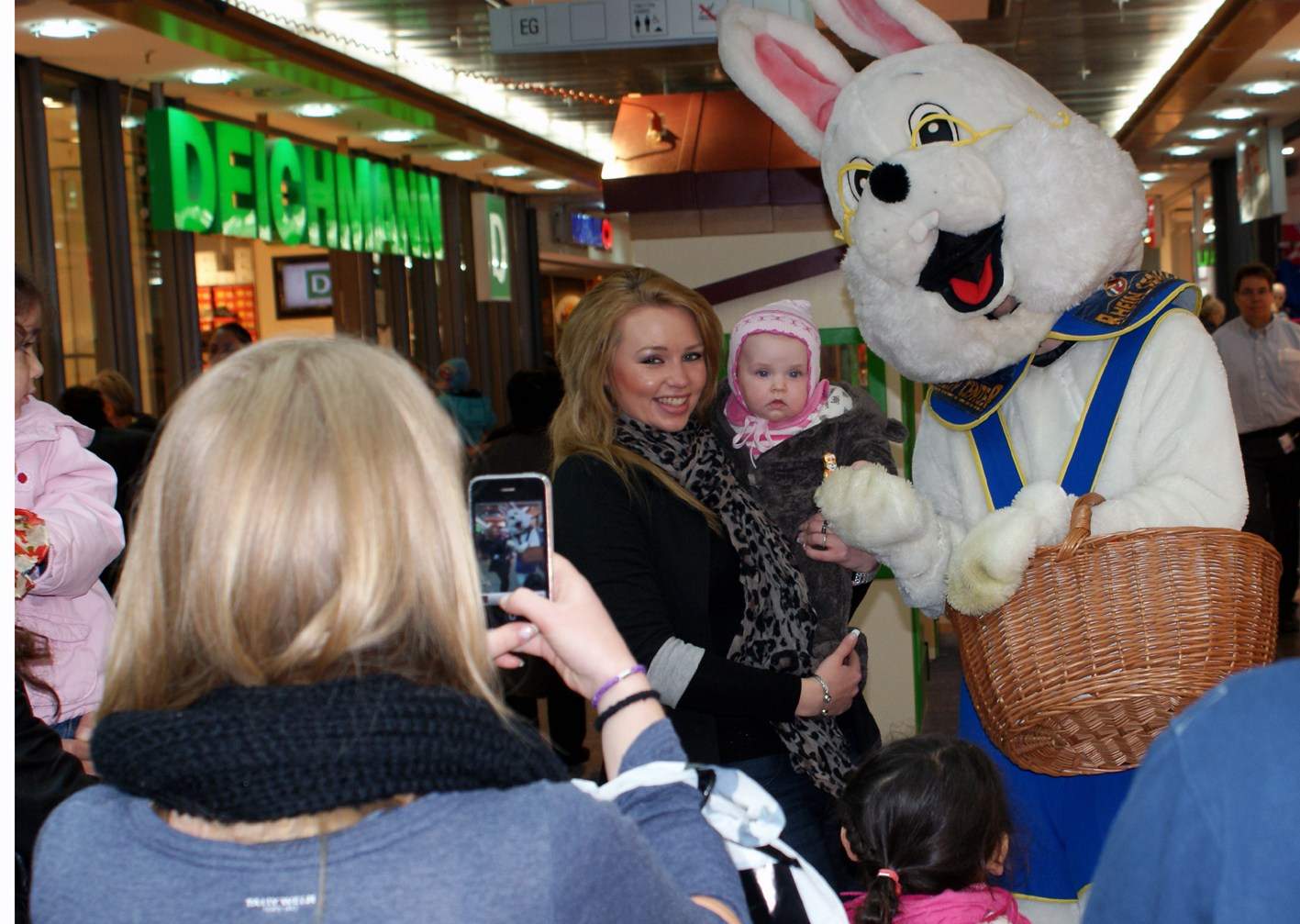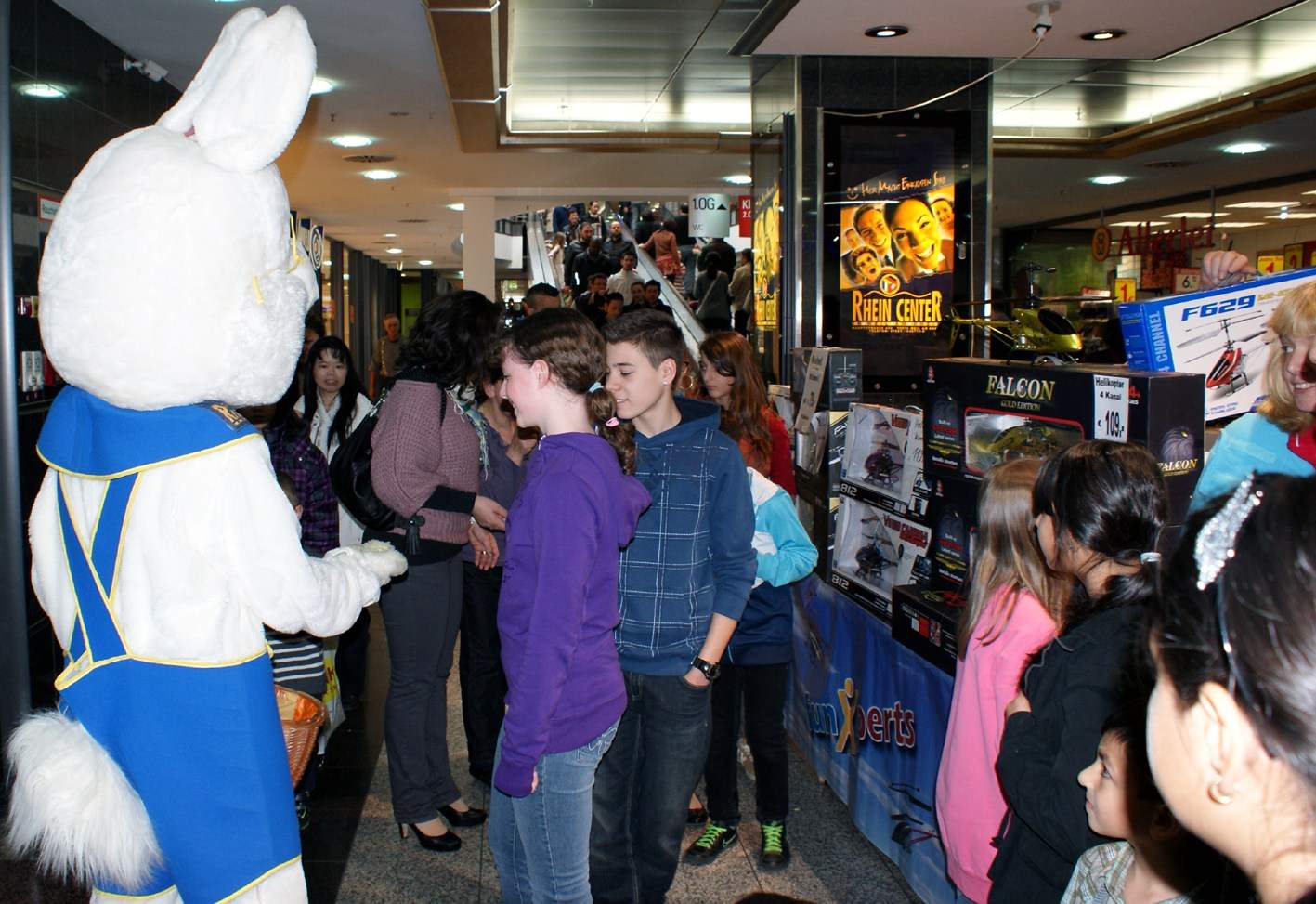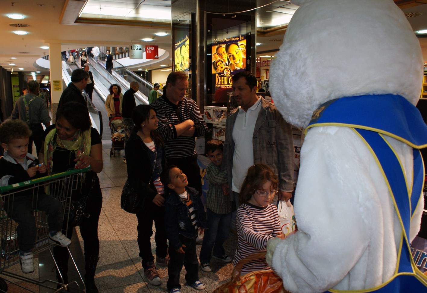 Am Mittag war es dann auch schon geschafft, dank der zahlreichen Helfer ging der Aufbau so schnell wie noch nie zuvor! Da an diesem Tag das Rhein Center seine Türen öffnete, konnten wir mit dem Verkauf gleich loslegen. Pünktlich um 13:00 Uhr strömten hunderte Menschen in die Geschäfte, viele blieben jedoch zunächst vor unserem Bauwerk stehen. Eine weitere Überraschung an diesem und zwei weiteren Tagen erwartete vor allem die jungen Besucher: Der Osterhase ging wieder herum. Zusammen mit seinen Helfern verteilte er im Auftrag der Werbegemeinschaft Rhein Center Süßigkeiten an die Kinder und sorgte so für leuchtende Kinderaugen. In dem Kostüm steckten verschiedene Leos wie Murat, Valentin, Julian und Andreas oder Clubbetreuer Gerhard. Aber auch der zehn Jahre alte Matthias Listl und sein Vater Manfred sowie Hildegard Pfahler, Betreuerin im Pflegeheim Markgräflerland, schlüpften in das Hasenkostüm.
