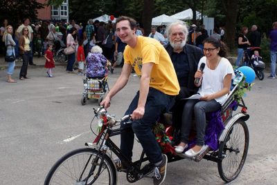 Sehr zur Freude der Besucher wurde auch im kulinarischen Bereich sehr viel geboten. Dank eines enormen Einsatzes des Alevitischen Kulturvereins, des Internationalen Frauencafés, des Kindergartens Bärenfels und des Mehrgenerationenhauses wurden leckere internationale Spezialitäten ebenso zu ganz zivilen Preisen verkauft wie Kaffee und Kuchen und frisch Gegrilltes. Für das leibliche Wohl war somit bestens gesorgt – und viele Besucher konnten gut gestärkt zu den Leos gehen und am traditionellen Teamparcours teilnehmen. Wie immer ging es dabei um Geschicklichkeit, Mut und vor allem um den gemeinsamen Spaß beim Bestehen der Aufgaben. Um dem Namen „Junior – Senior“ gerecht zu werden, durften nur Paare mit einem Altersunterschied von mindestens 30 Jahren an dem Parcours teilnehmen. Schön zu sehen war es, wenn sich Kinder mit ihnen zuvor fremden Erwachsenen zusammentaten und gemeinsam antraten. Es gab viel zu tun, etwa das Ringe-auf-Stuhlbeine-werfen oder das Einsammeln von Bechern während einer Seifenkistenfahrt. Gemeinsam mussten zwei Schätzaufgaben bewältigt werden und zwischendurch durfte man sich zu zweit in einer Rikscha fahren lassen. Als Rikschafahrer leistete Leo Valentin Tesche ganze Arbeit: Mehr als 50 Paare chauffierte er zur benachbarten Rheinschule, auf deren Schulhof die vom Kidstreff Friedlingen betreute Station „Kettcars“ aufgebaut war. Klar, dass Valentin am Abend sichtlich erschöpft war; er hatte aber auch viel Spaß an der Aktion gehabt!