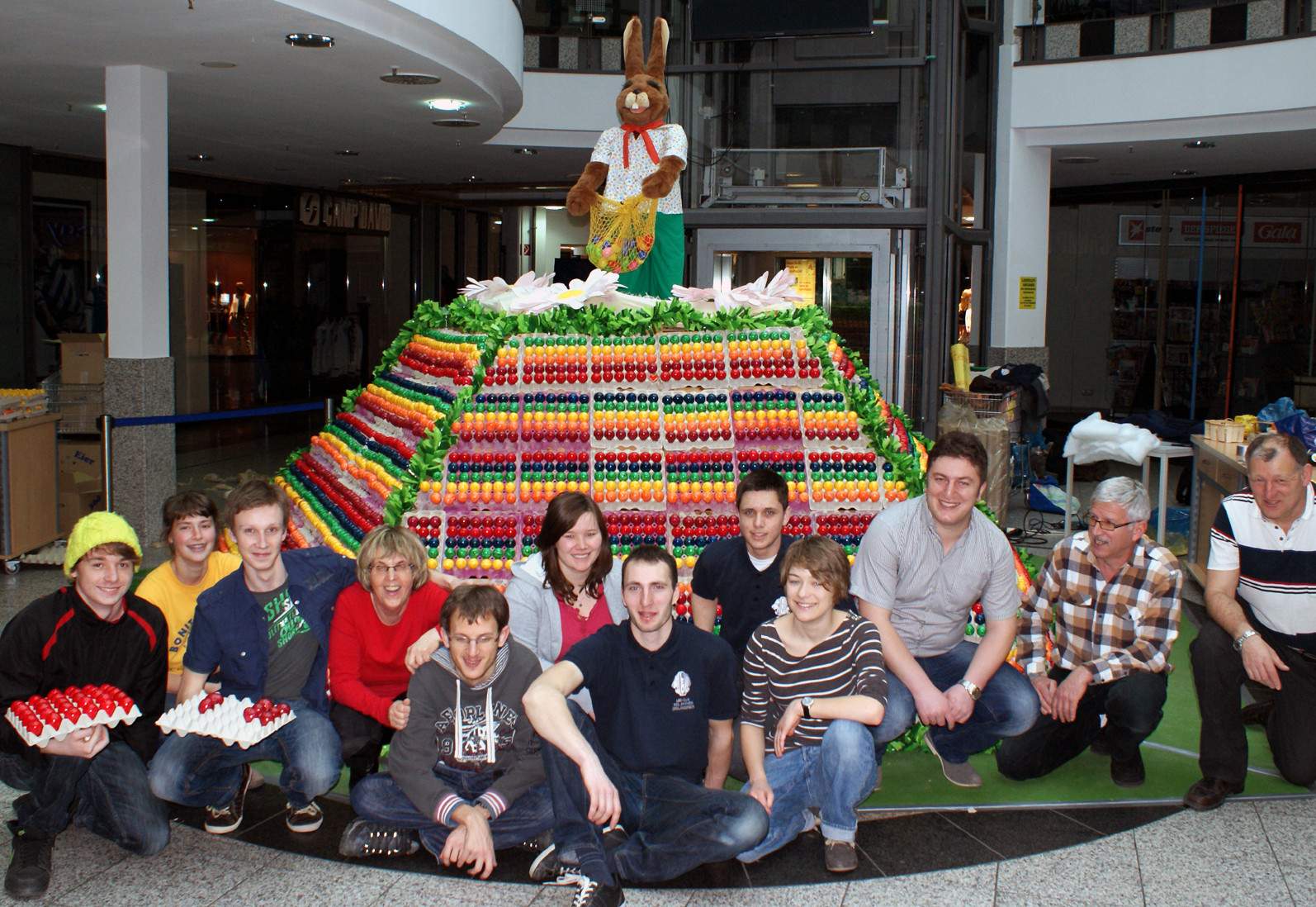 Die Ostereieraktion 2013 lief so ab wie in den Jahren zuvor. Aufbau am Sonntag, Verkauf von Montagmorgen bis Donnerstagabend. Weil 25 Cent für ein gefärbtes gekochtes Ei nicht viel sind und auch weil es wieder 120 20-Euro-Gutscheine zu gewinnen gab, stellte es kein Problem dar, die riesige Menge zu verkaufen. Genauer gesagt, es wird von Jahr zu Jahr einfacher, weil sich diese von der Werbegemeinschaft Rhein Center finanzierte Ostereier-Aktion bei der Kundschaft aus Deutschland, aus der Schweiz und aus Frankreich großer Beliebtheit erfreut. Und die Leos freuen sich, dass sie diese Möglichkeit haben, auf diese zwar arbeitsintensive, aber eben auch nette Art viel Geld für die Finanzierung ihrer zahlreichen Projekte zu verdienen. Vor allem das Dauerprojekt „Begegnungen“ profitiert seit mehr als zehn Jahren von den Aktionen im Rhein Center. Klar, dass die Leos am Gründonnerstag und am Karsamstag auch wieder als Osterhasen durchs Center gehoppelt sind und zentnerweise Süßigkeiten verschenkt haben.