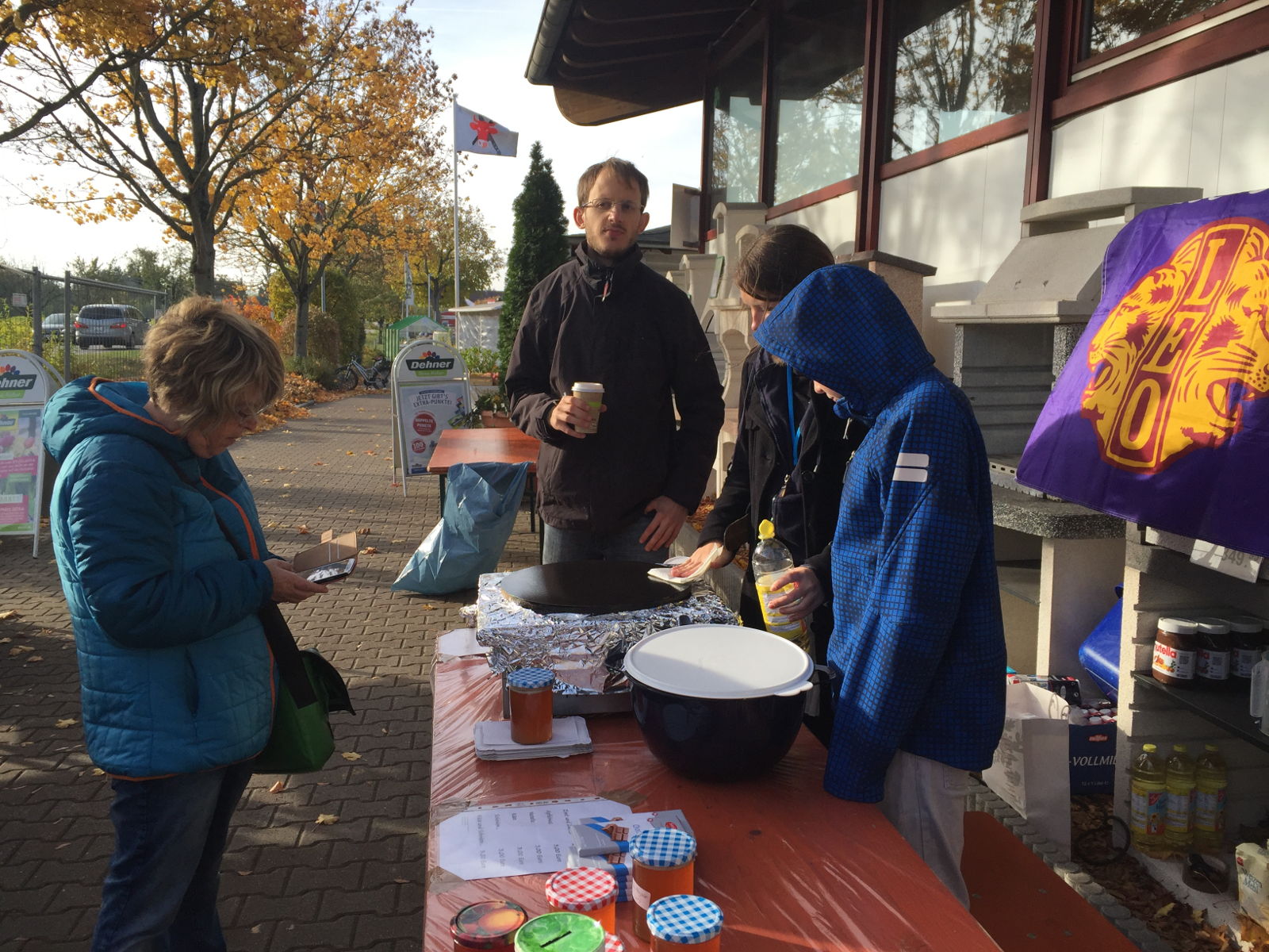 Am 10. und 24. Oktober sowie am 27. November stehen wir vor dem Dehner Gartencenter in Binzen und verkaufen den selbst zubereiteten Crêpes für einen kleinen Betrag. Ziel der Aktion ist es, dass Clubkonto aufzubessern und den Leo-Club so besser finanzieren zu können. Das Geld fließt nicht direkt in unsere Aktionen, dafür sind Spenden da. Mit den Einnahmen werden Mitgliederbeiträge, Werkzeuge und anderes Material bezahlt, welches der Club benötigt und bestehen zu können.