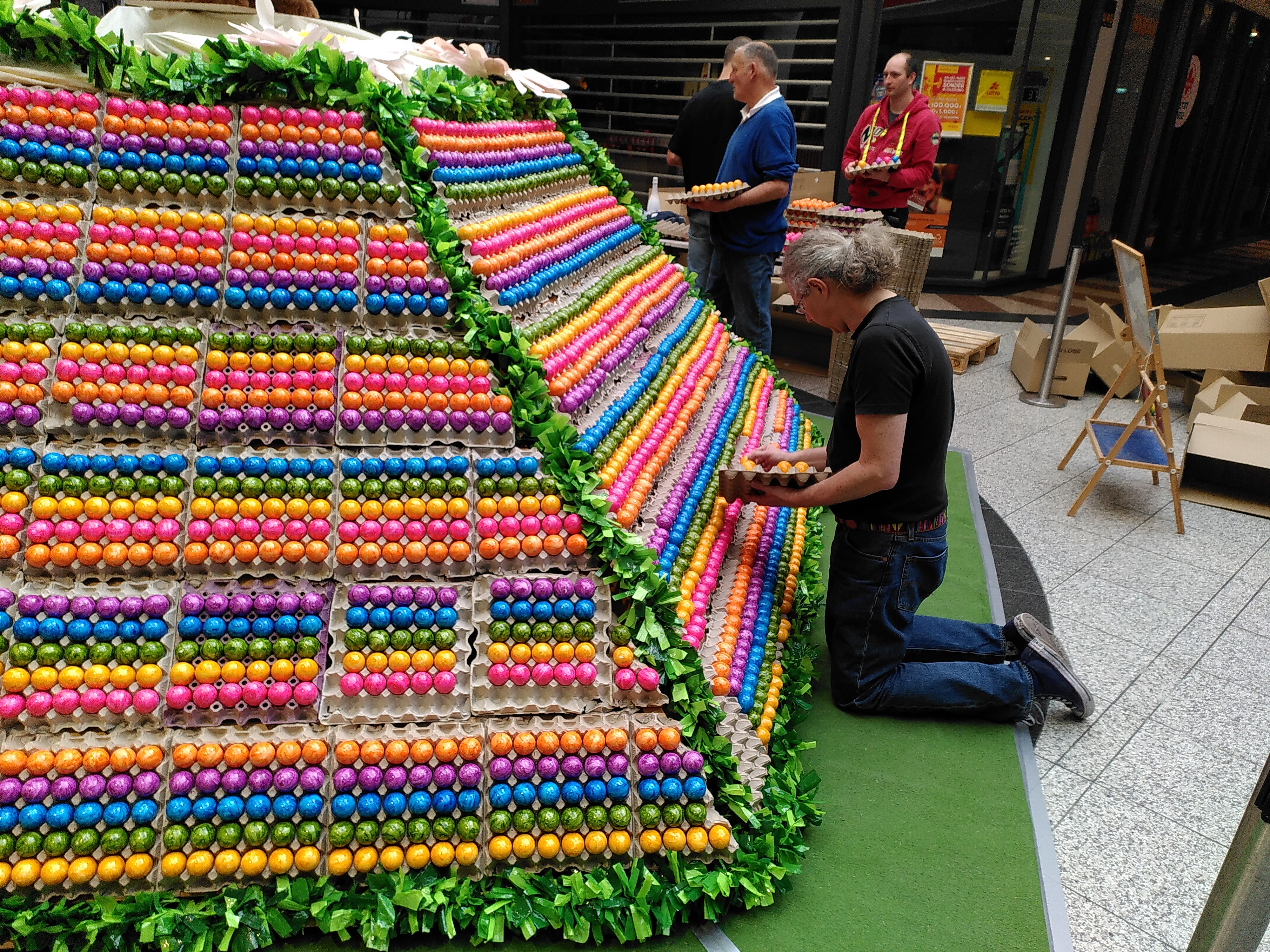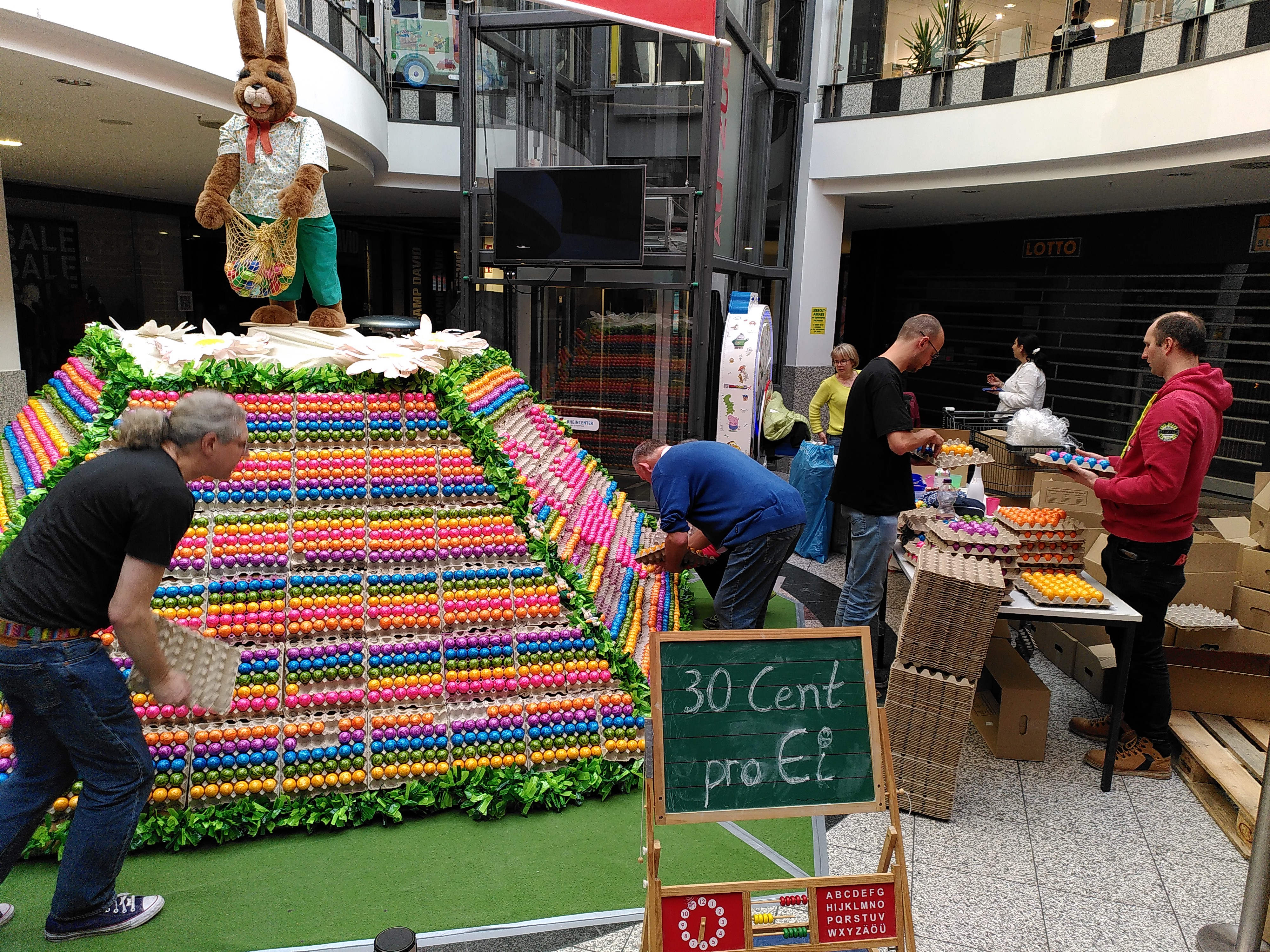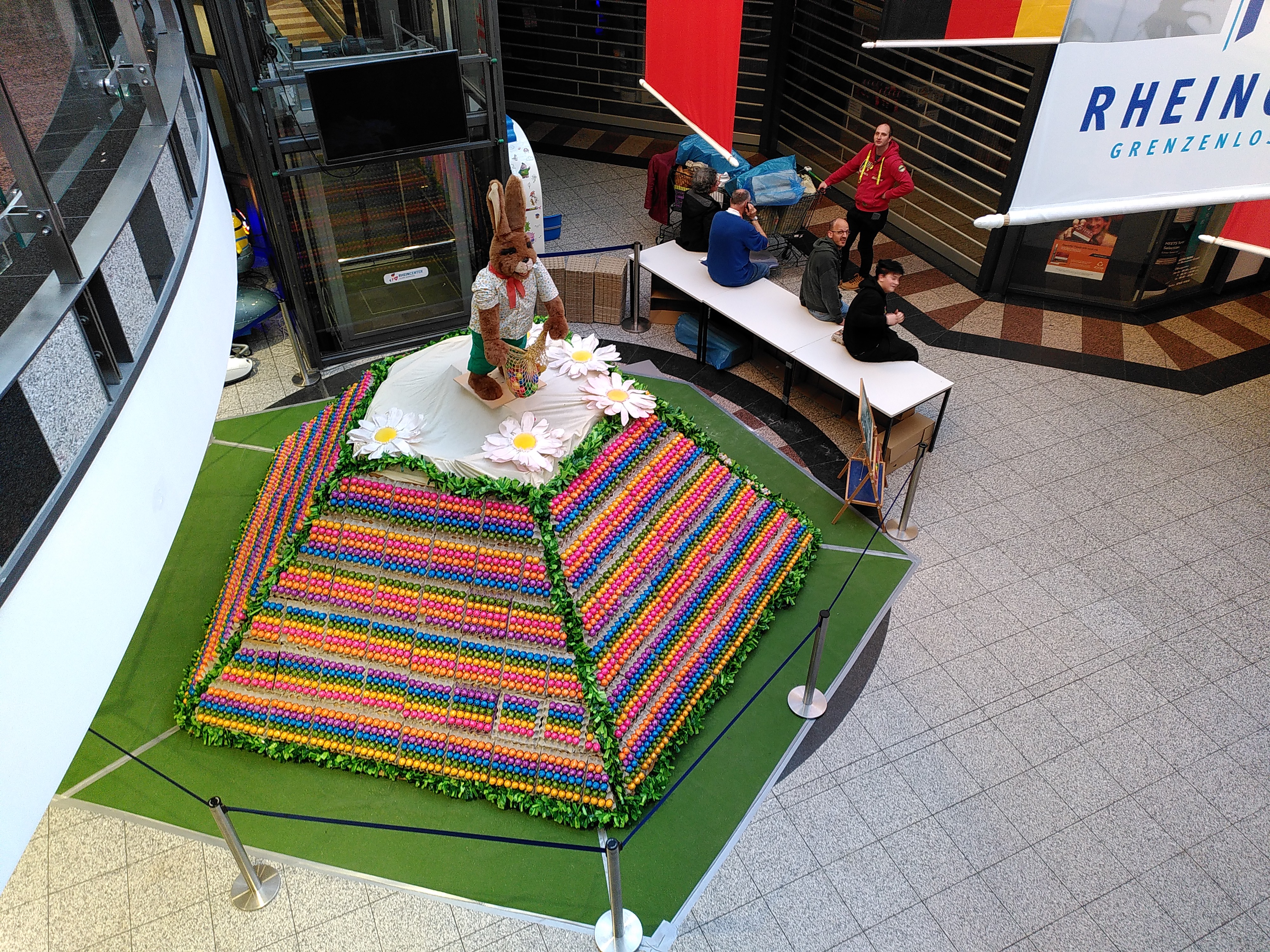 Wie schon in den vergangenen sieben Jahren bildeten in der Karwoche wieder bunt gefärbte und adrett angeordnete Eier einen Blickfang in der Passage des Rhein Centers. Die essbaren Hinweise auf das Osterfest wurden am Sonntagnachmittag von Mitgliedern des Weiler Leo-Clubs auf einem großen Pyramidenstumpf mit fünfeckiger Grundfläche gesetzt. Solange der Vorrat reichte, wurden die Ostereier bis am Mittwoch täglich zwischen 8.00 und 20:00 Uhr zum Stückpreis von 30 Cent für einen guten Zweck verkauft.