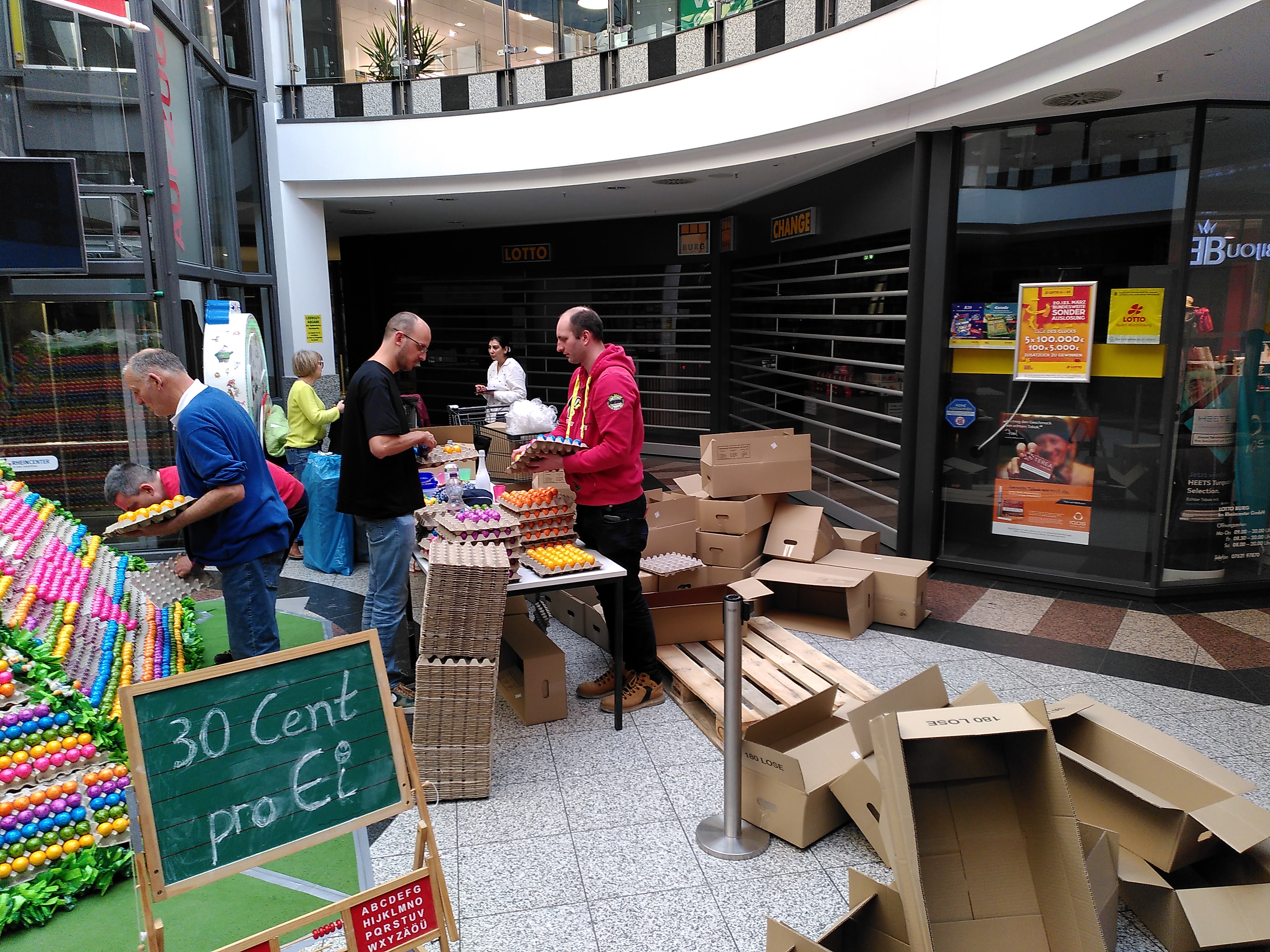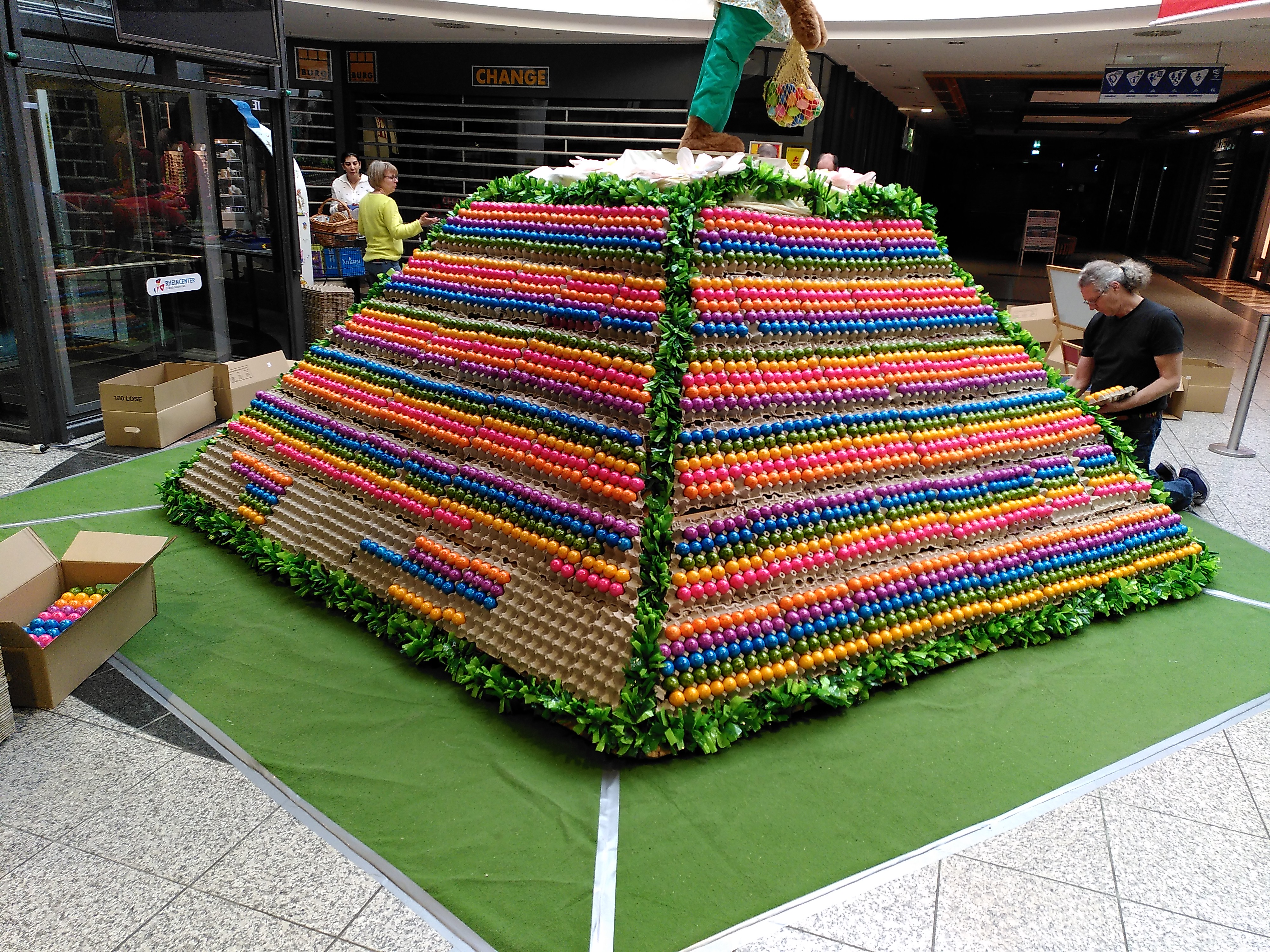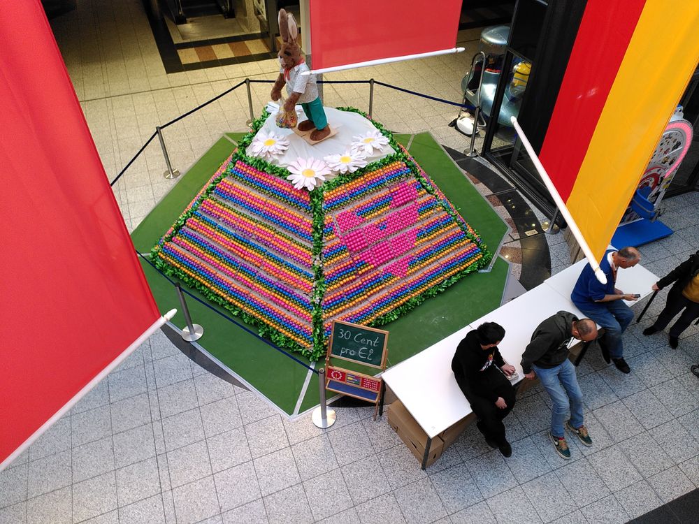 Wie schon in den vergangenen sieben Jahren bildeten in der Karwoche wieder bunt gefärbte und adrett angeordnete Eier einen Blickfang in der Passage des Rhein Centers. Die essbaren Hinweise auf das Osterfest wurden am Sonntagnachmittag von Mitgliedern des Weiler Leo-Clubs auf einem großen Pyramidenstumpf mit fünfeckiger Grundfläche gesetzt. Solange der Vorrat reichte, wurden die Ostereier bis am Mittwoch täglich zwischen 8.00 und 20:00 Uhr zum Stückpreis von 30 Cent für einen guten Zweck verkauft.